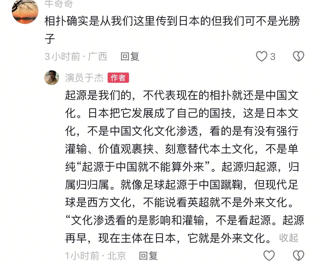 演员于杰吐槽温州一家游乐园摆放相扑的雕像,说这是所谓的文化入侵,在评论区里也有网友表示相扑是从我们中国传过去的,但是于杰却告诉我们。哪怕是从我们这边传过去的,但也不代表这是我们的文化,只是说传过去而已,然后那边将这个文化改变成了自己的主体。就比如蹴鞠,蹴鞠是我们中国的传统文化,但现在演变成了足球。而足球的话就是西方文化了。