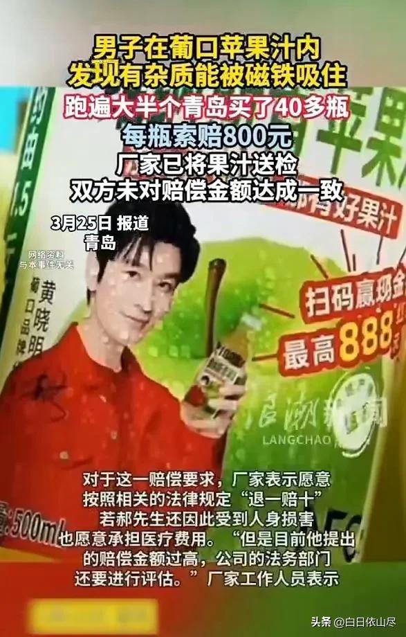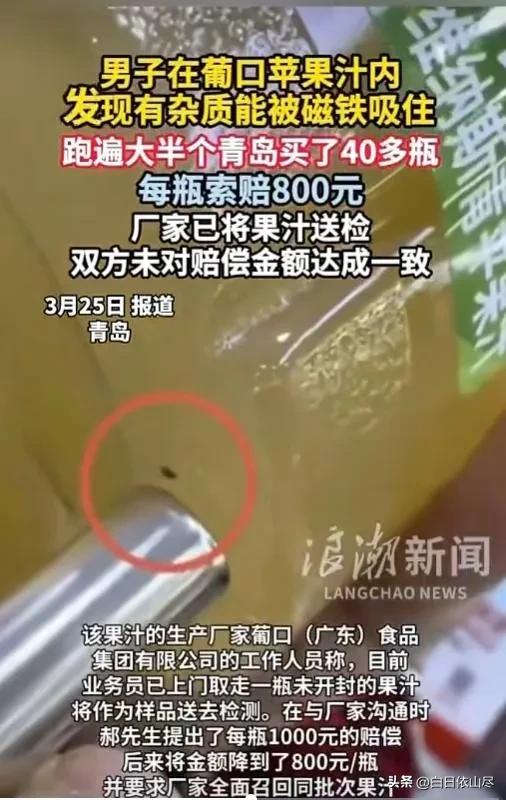 山东青岛,男子无意间发现,他买的果汁里有反光杂质,隔着瓶子用磁铁一吸就能吸住,他没声张,跑了大半个城市买了40瓶同批次果汁,确定每一瓶里都有杂质后,他直接联系厂家,提出每瓶赔偿1000块,厂家表示,只能退一赔十。