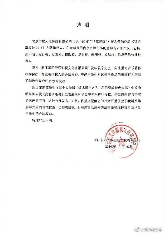据悉,2019年,庞麦郎曾在微博发布《我的滑板鞋》之表演权未对华晨宇进行授权的内容,随后华晨宇工作室发布声明回应,称华晨宇对《我的滑板鞋》的表演行为已事前获得歌曲著作权方华数传媒合法有效的授权,属于合理合法行为,庞麦郎微博内容与事实情况严重不符,公开扩散已构成侵权,公司将保留法律追责权利。
