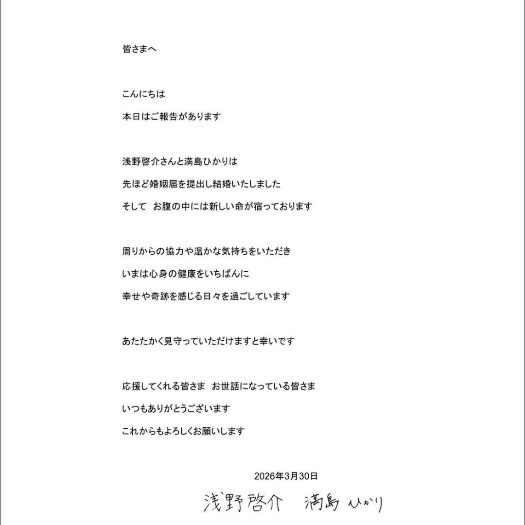 满岛光宣布再婚&怀孕,男方为模特浅野启介。她曾于2010年与电影导演石井裕也结婚