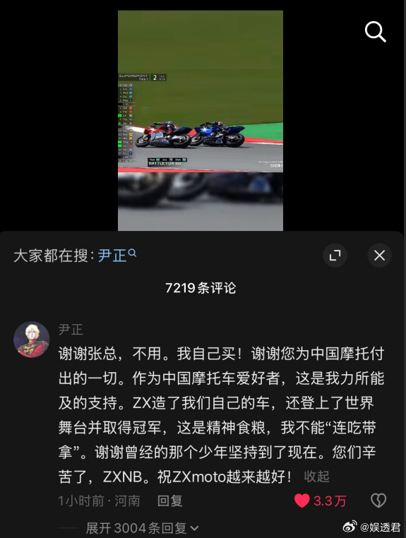 张雪说要赠送尹正机车谁能想到影视情怀和现实追梦完美重合,飞驰人生的故事不再只存在剧中,尹正和张雪的相遇,就是普通人最向往的热血双向奔赴