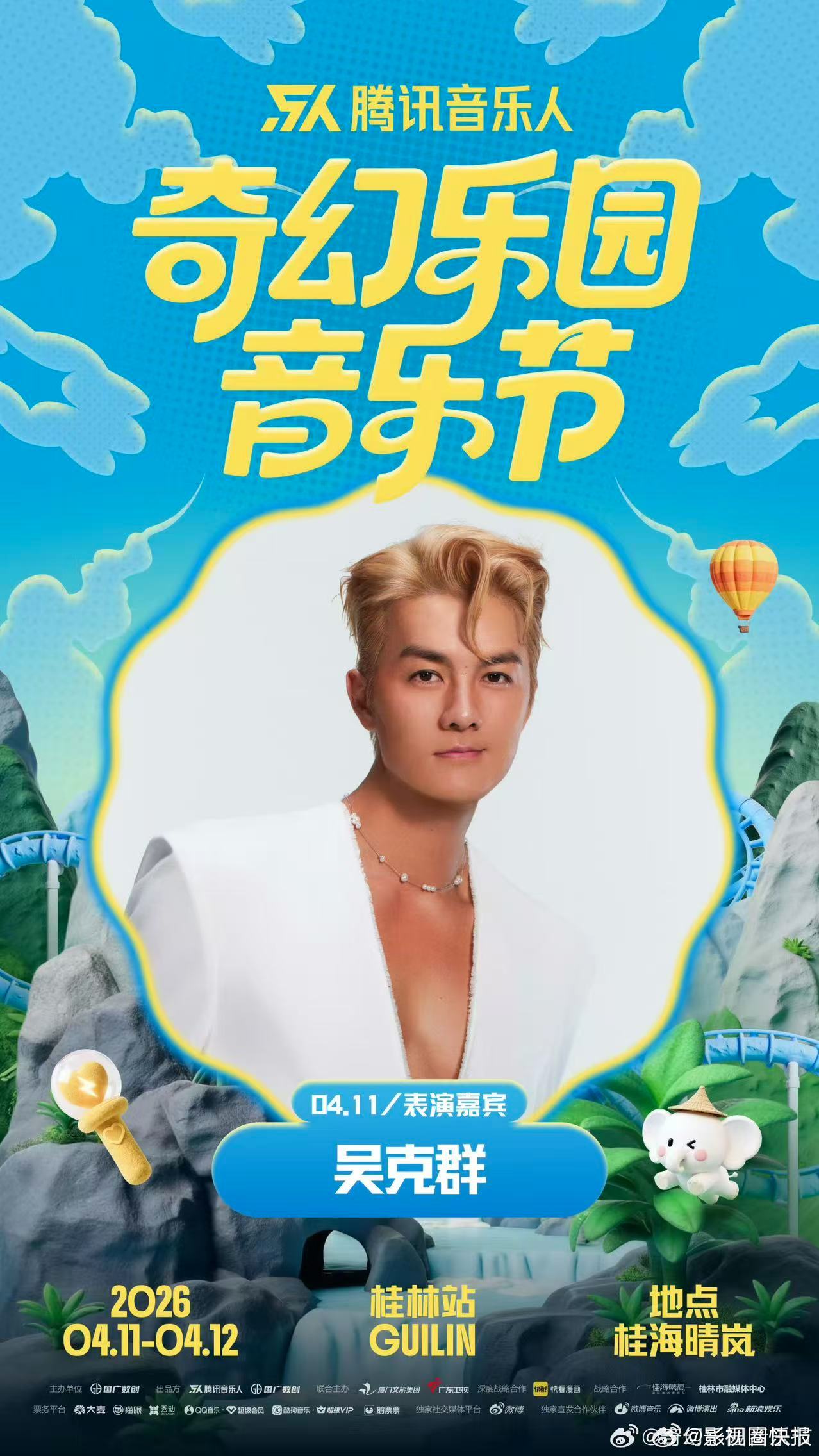 奇幻乐园音乐节官宣吴克群腾讯音乐人奇幻乐园音乐节桂林站正式官宣吴克群加盟。吴克群