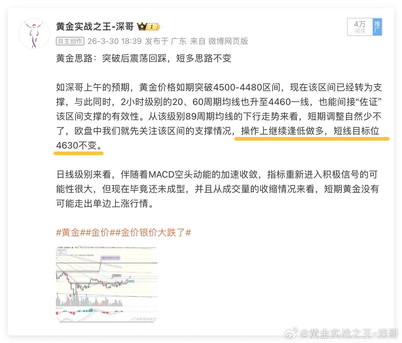 周一金价在触及4580压力后回落,今天(3月31日)金价开市上涨,高点来到我们昨晚说的4615-30压力区间(图3)。今天月线收官,在周线上可以看到均线系统较此前并无变化(图1),20周移动平均线仍处于4650上方延伸,似乎未受此前几周大幅回吐的影响。近期一旦看到价格重返4660,金价很有可能再度开启涨势,回到5000美元的概率不低。