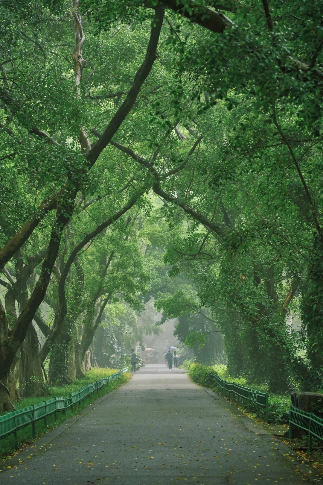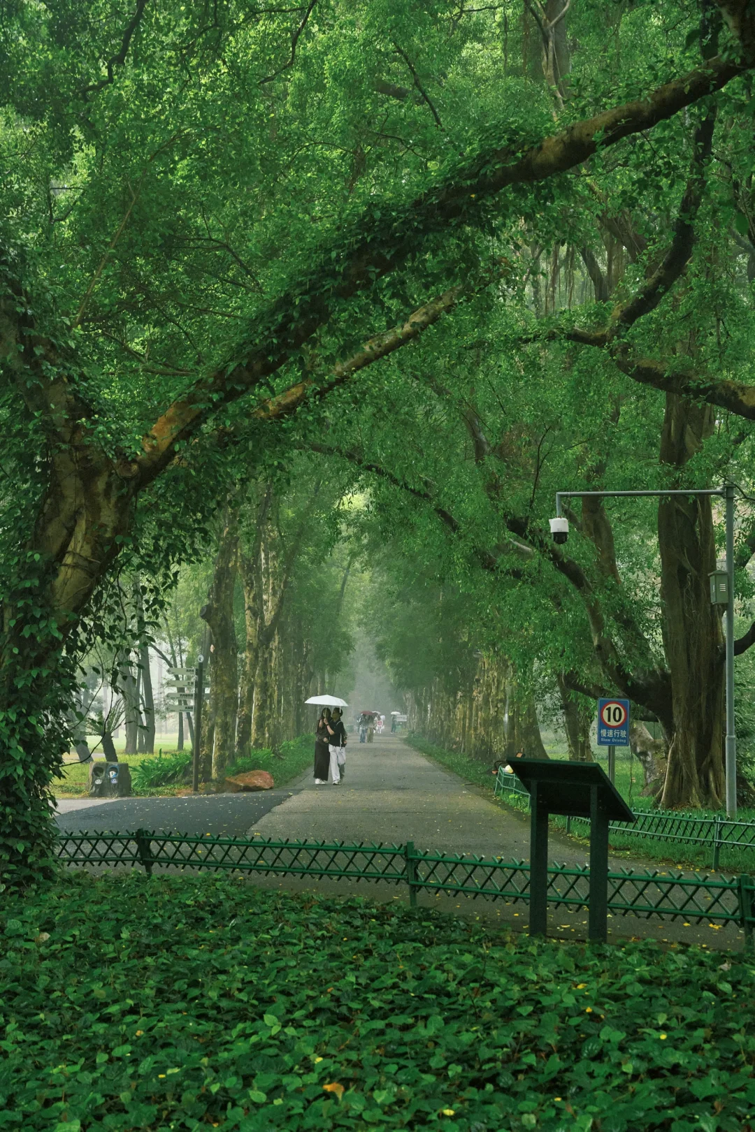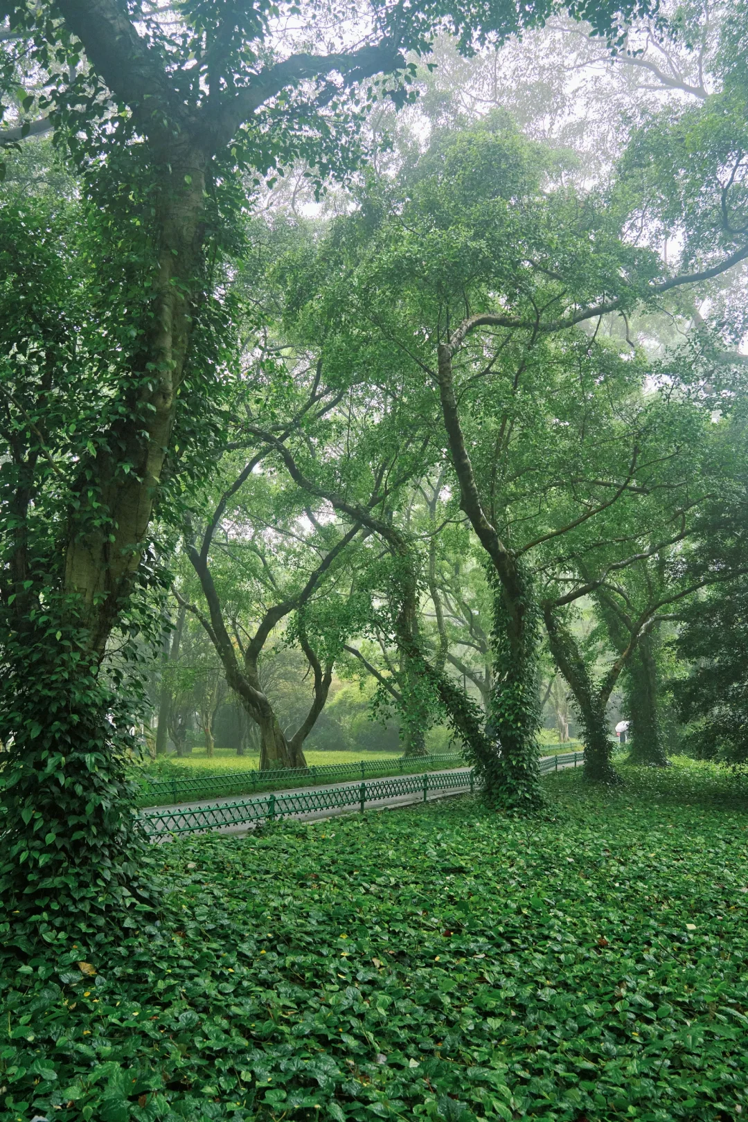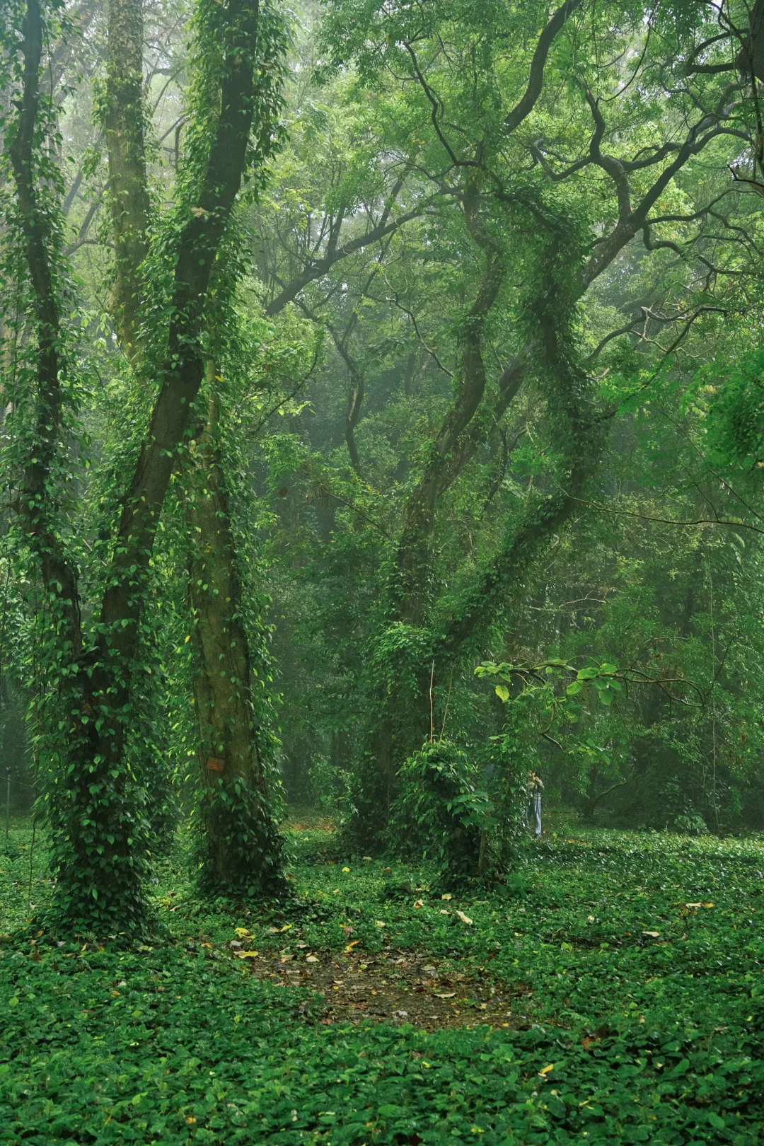 林间小径被绿植环绕,雾气在林间慢慢游走☔️撑伞的人从远处走来,自带朦胧氛围感🌫️像极了现实版的绿野仙踪🌿~