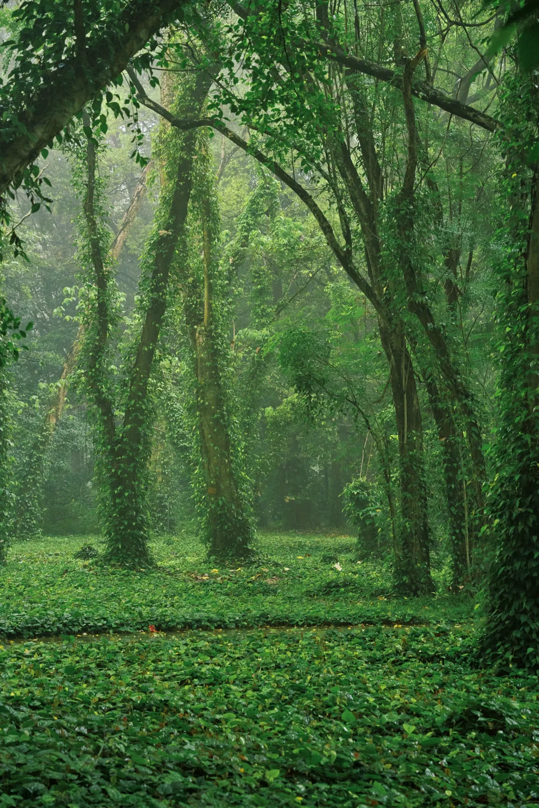 藤蔓顺着古树的枝干肆意攀爬🌿翠绿的叶片缀满枝头,雨水打湿后更显鲜亮,每一片脉络都藏着生命力~