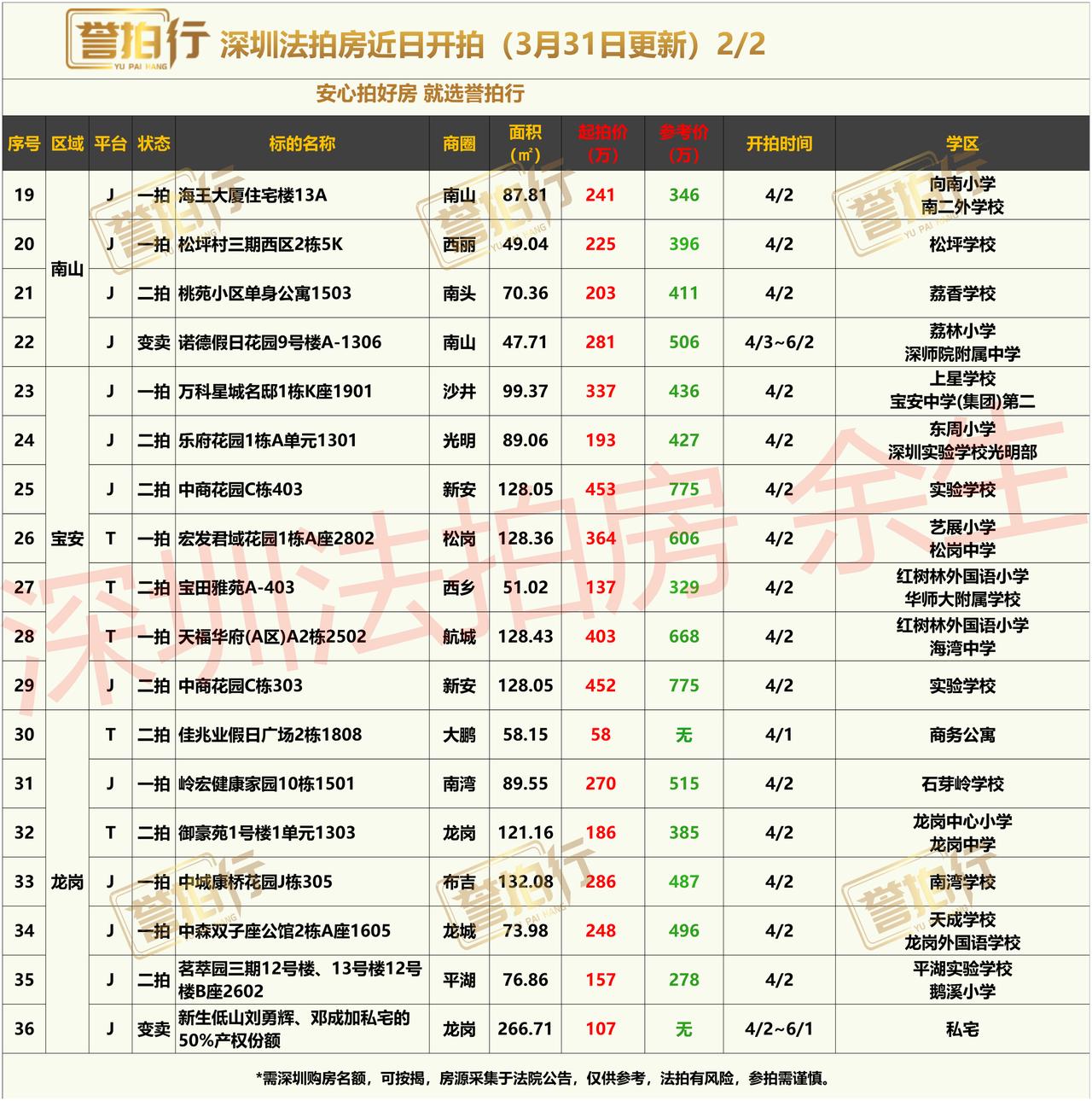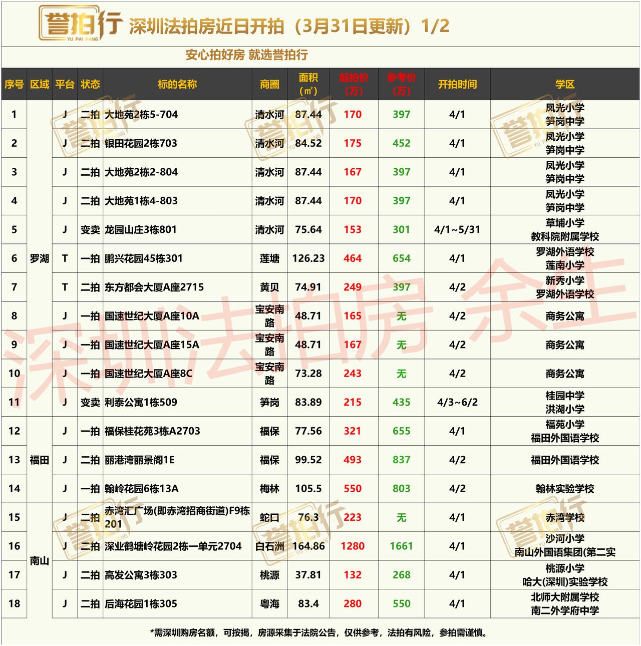 深圳法拍房:近期开拍,好多好房~ 1、银田花园,单价只要2.2万,很不错 2、大地苑,单价只要1.9万,很不错 3、鹏兴花园,地铁口,单价只要3.7万,很不错 4、翰岭花园,单价只要5.2万,价格不错 5、深业鹤岭花园,次新楼,单价7.7万,很不错 6、后海花园,单价只要3.3万,很不错 7、海王大厦,地铁口,单价2.7万,很不错 8、松坪村,单价4.6万,价格不错