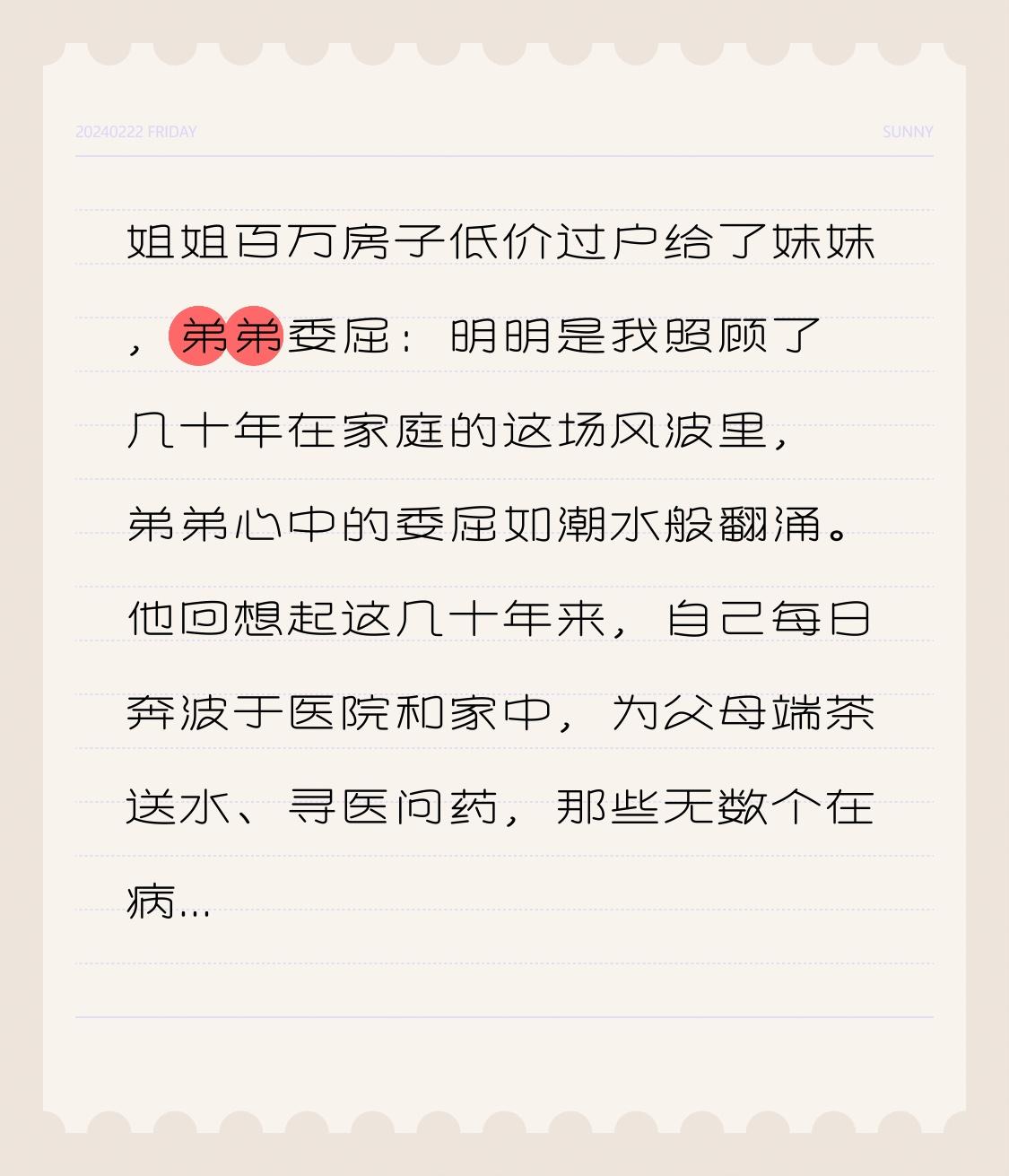 姐姐百万房子低价过户给了妹妹,弟弟委屈:明明是我照顾了几十年在家庭的这场风波里,弟弟心中的委屈如潮水般翻涌。他回想起这几十年来,自己每日奔波于医院和家中,为父母端茶送水、寻医问药,那些无数个在病床前守夜的夜晚,每一分每一秒都是他对家庭责任的坚守。