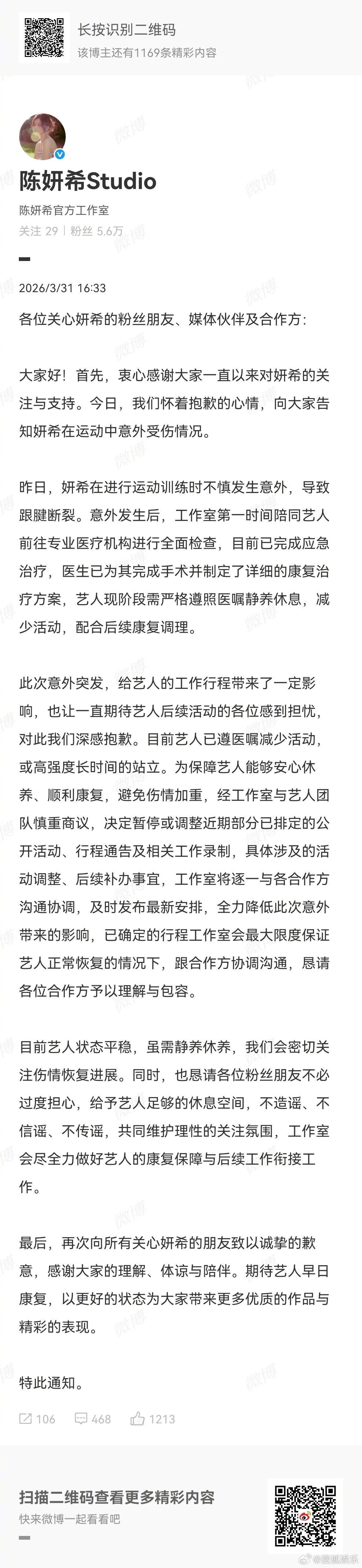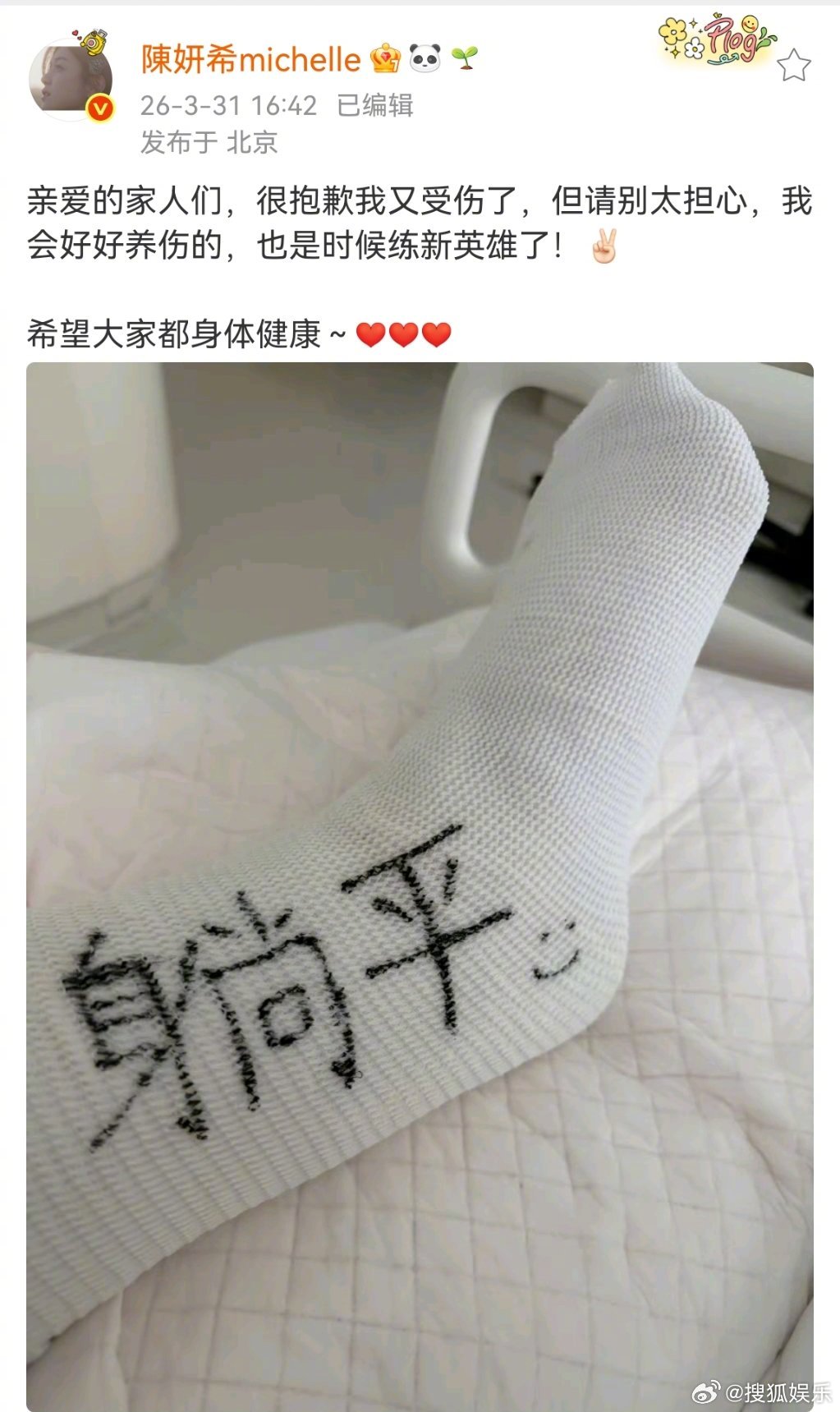 陈妍希受伤 发博表示自己又受伤了,不过让大家不用担心,会好好养伤的!工作室解释称