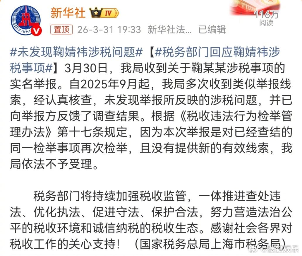 未发现鞠婧祎涉税问题 国家税务总局上海市税务局发布情况通报: