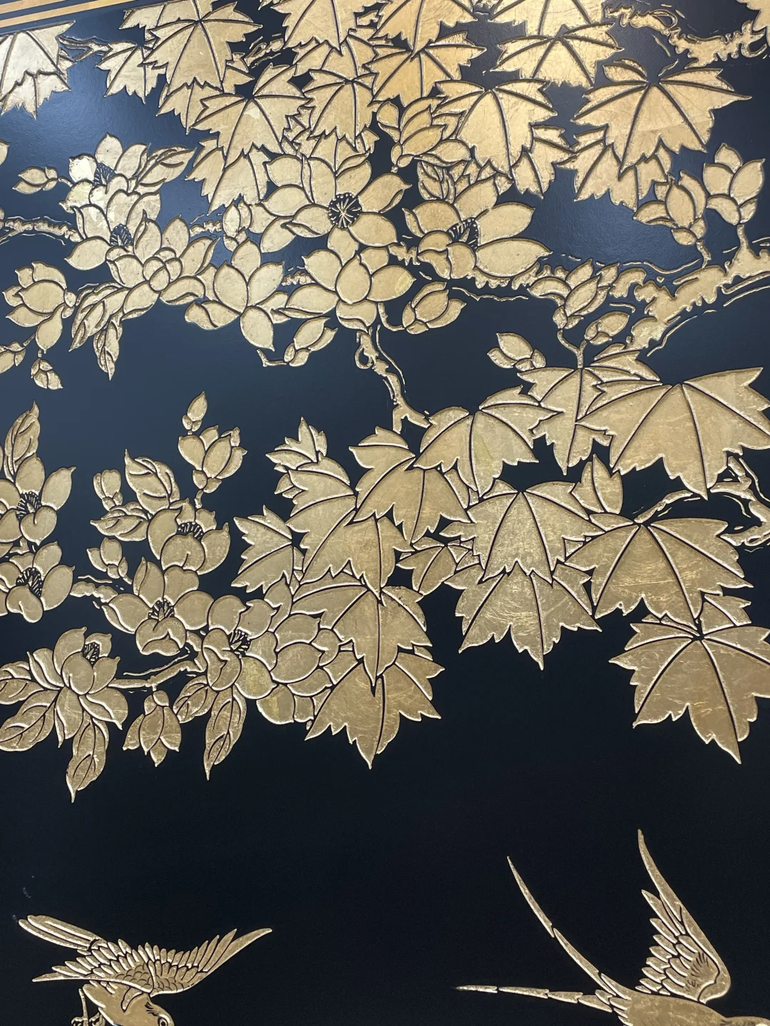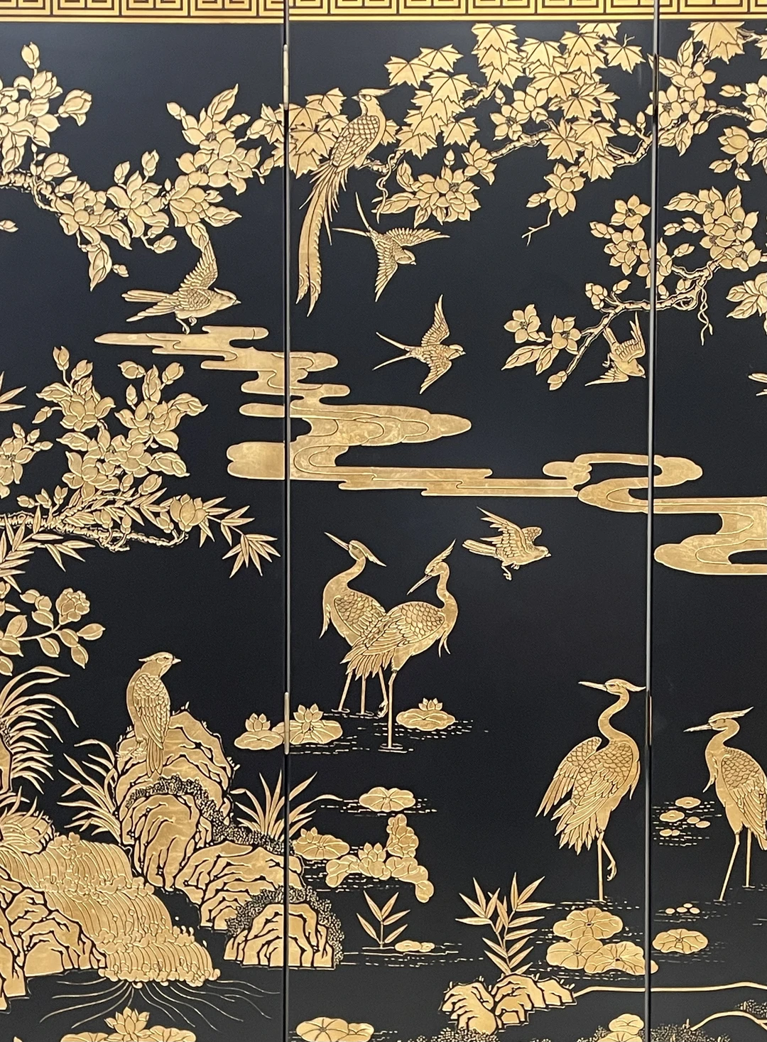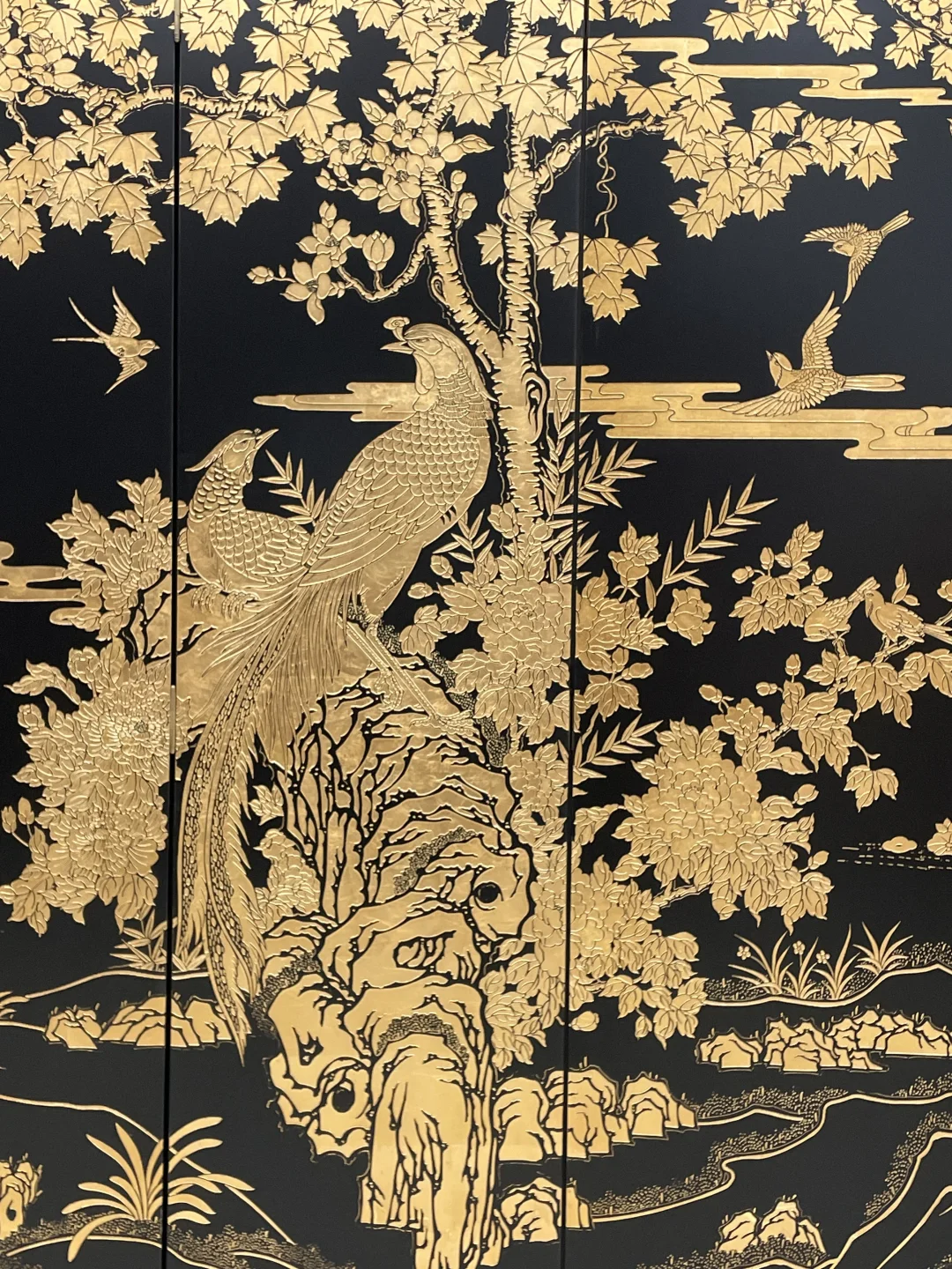黑底手工刻漆➕贴金箔工艺,花鸟鹤松的纹样太精致了,每一笔都透着中式奢华感 朋友来家里都以为是古董级藏品,其实是我精心挑选的软装单品✨ 中式屏风 东方美学 软装搭配 餐厅设计 黑金系家居 新中式灯光 物