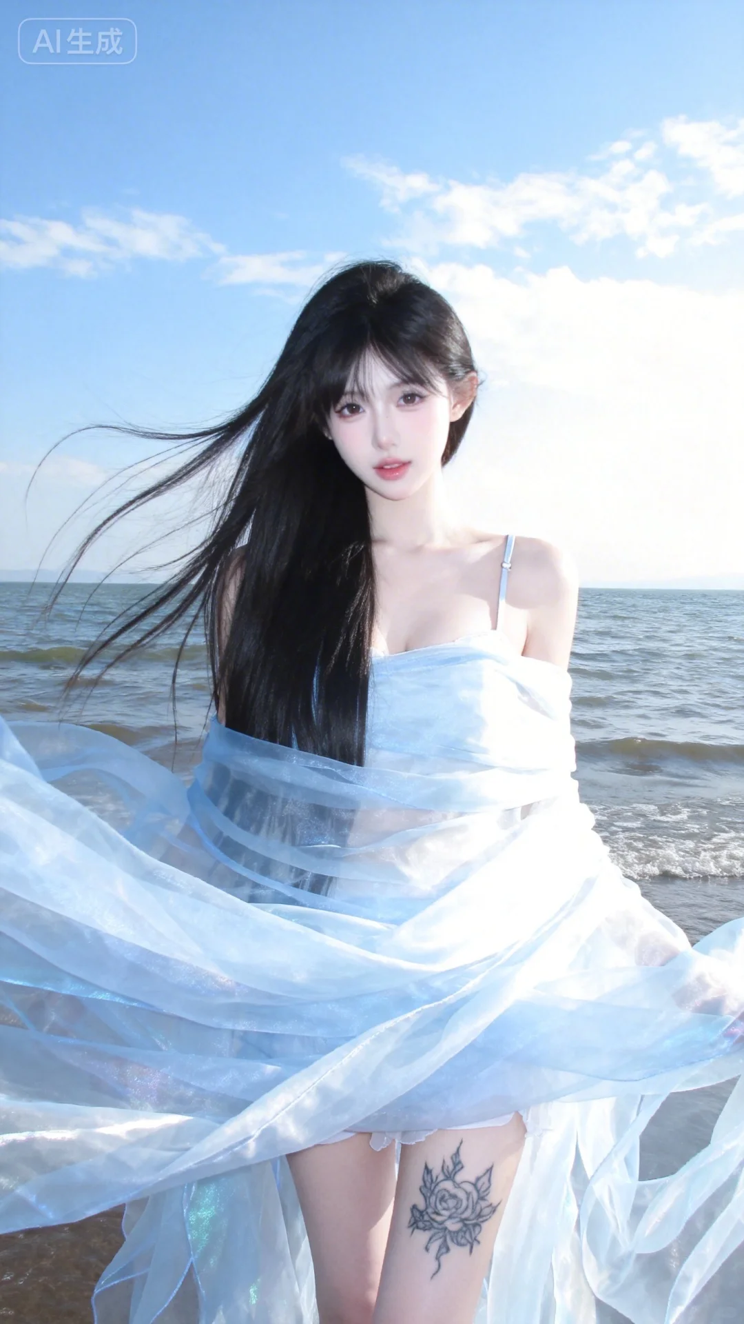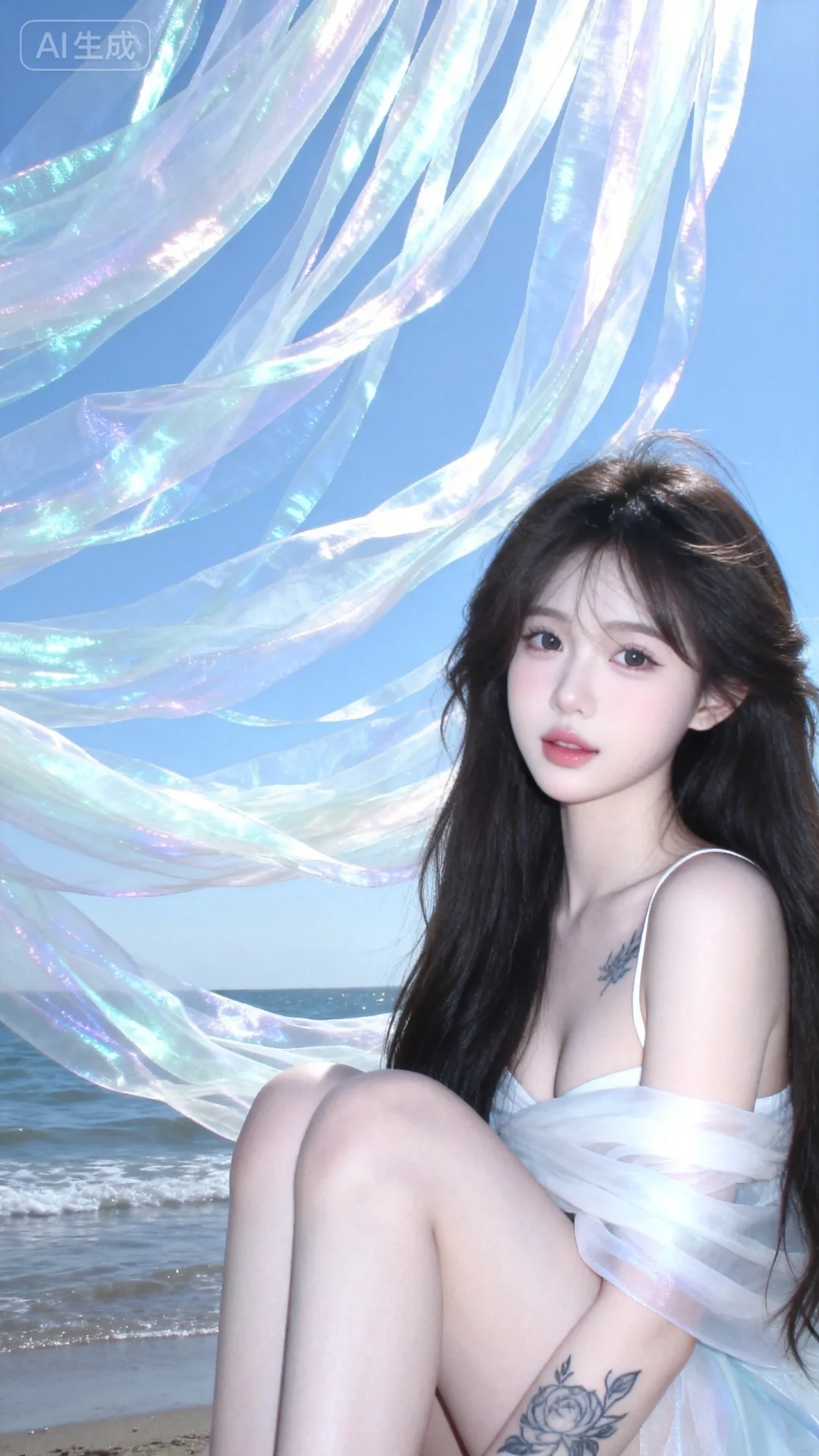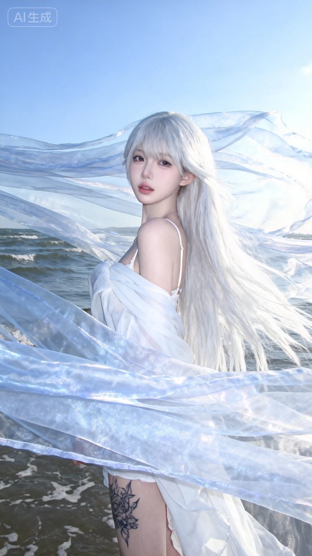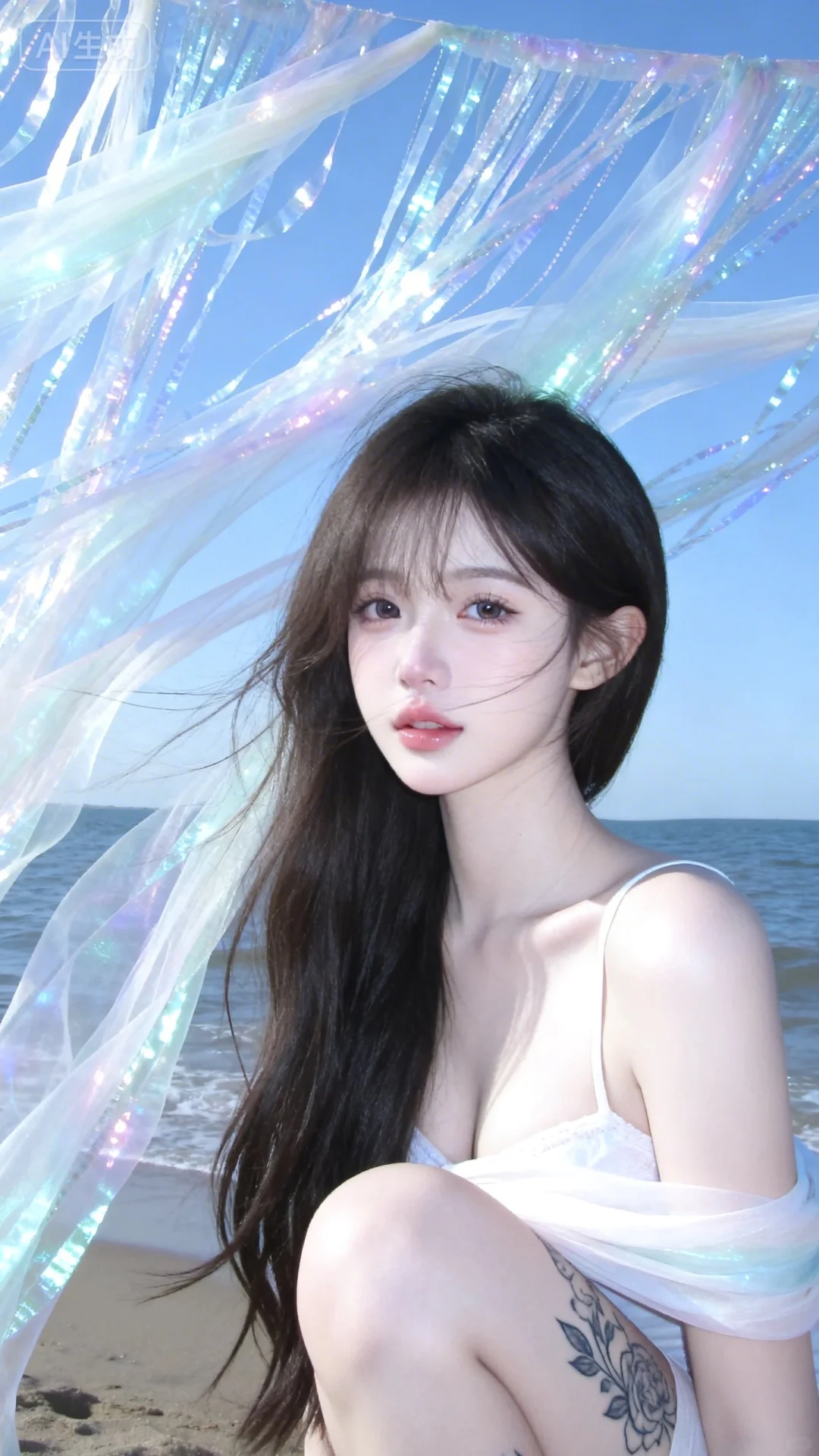 一位长发及腰、模样似洋娃娃般可爱的女生。构图随意却尽显生活中的绚丽日常,人像摄影,日常快照风格,非精心构图或打光,感受风,害羞,妖冶少女,冷白皮,瓜子脸尖下巴,皮肤白皙,底妆通透,肤色均匀自然,小上围,纯欲风,不看镜头,发丝清晰可见。光线柔和自然,非均匀打光,表情自然松弛,照片毫无修饰感,带有生活真实感。ccd拍照感,大腿纹身。肩带滑落,采用梦核梦幻的视觉风格,晴朗的天空之下,一位甜美白皙的少女被漫天垂落的流光轻纱所环绕大海边轻纱层层叠叠随着风轻轻飞扬,似那梦幻的海浪翻涌着,光影柔和而通透,在微风将轻纱微掀之时,少女温柔甜美的脸庞映入眼帘,画面意境唯美空灵,拥有4K超清的画质效果。