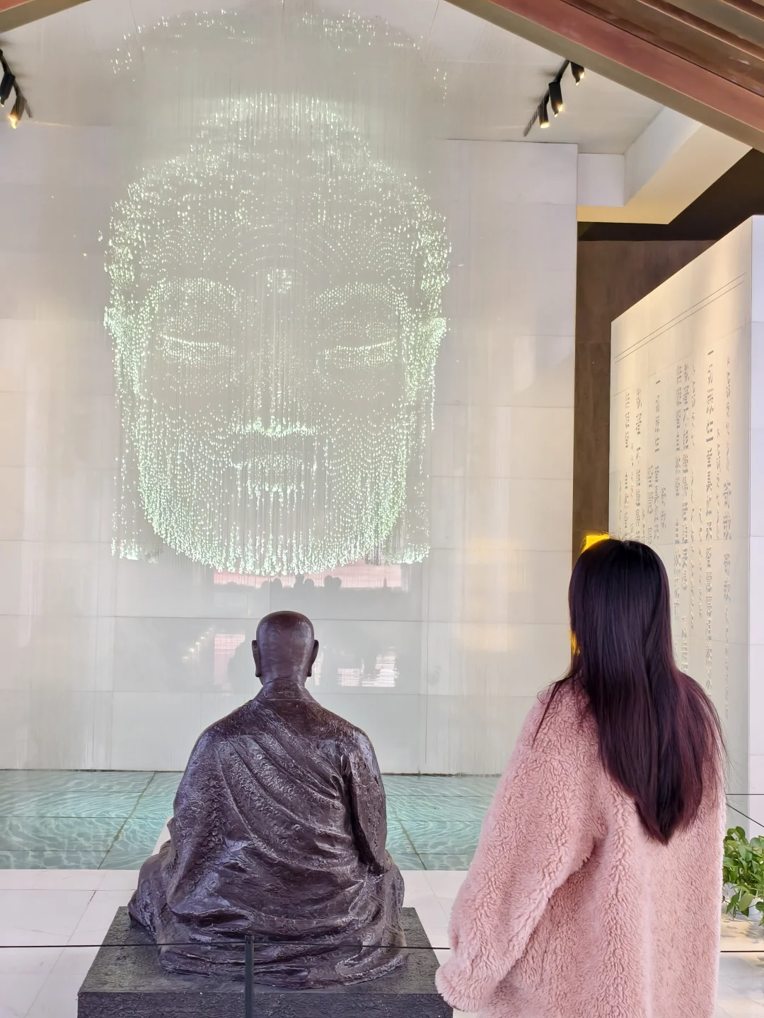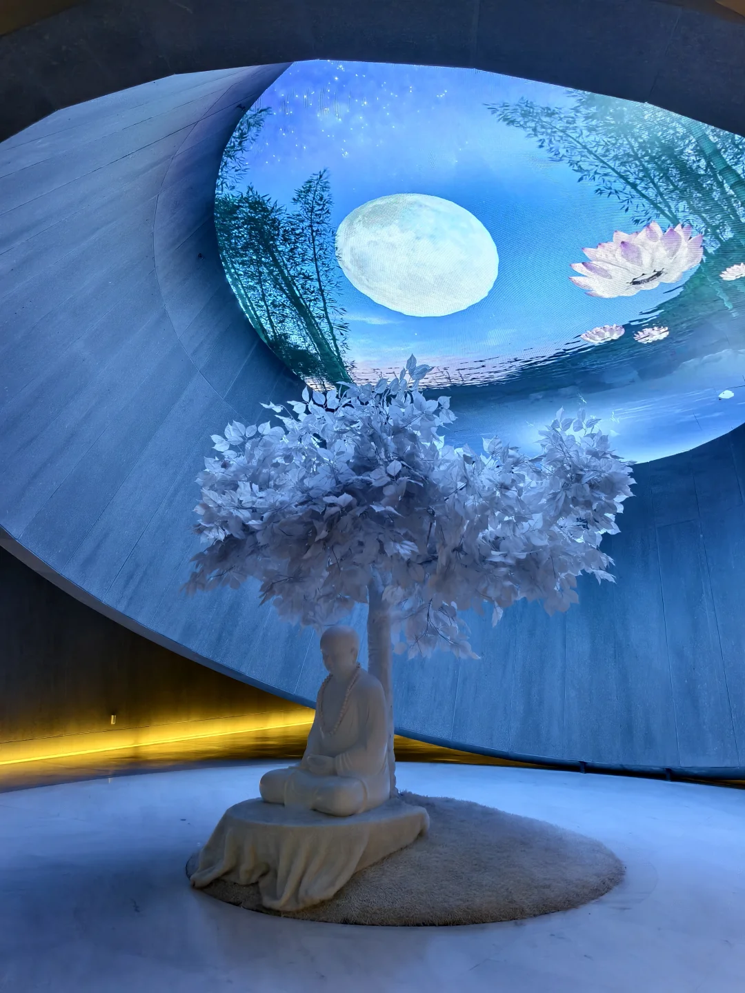 [打卡R]博物馆中个人蕞喜欢的是“千年对望”打卡点。展厅两旁共八根琉璃立柱,寓意释迦牟尼佛八相成道;步道上七朵莲花的感应频,人走上去依次亮起,寓意佛陀“七步生莲”。