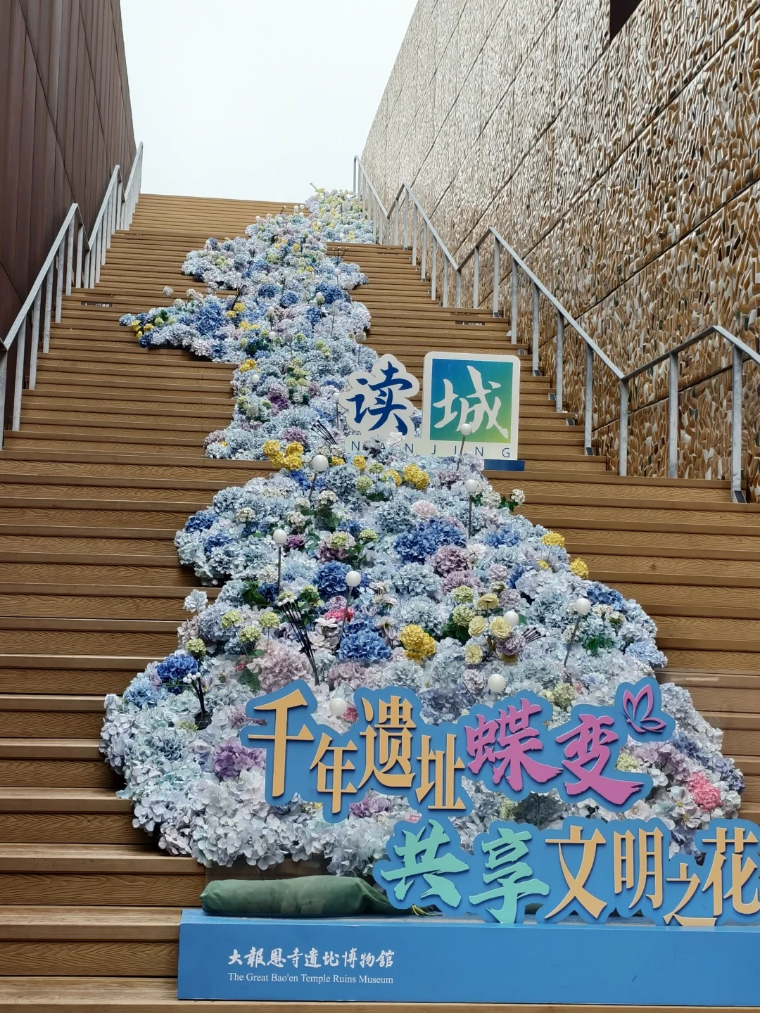 正大门南京书→进门右手边神兽赑屃→直行看到许愿墙→左手为绣球花梯