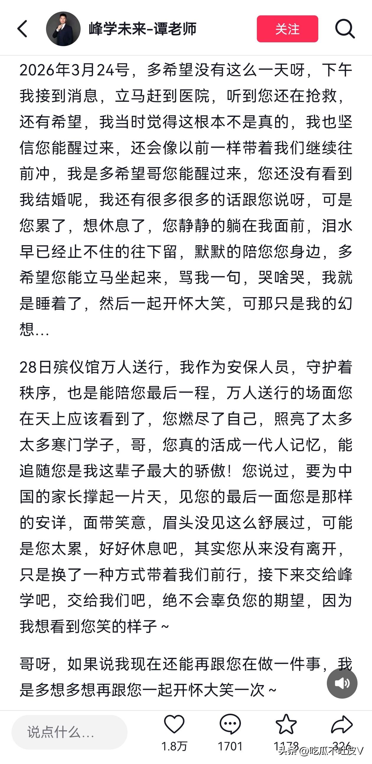 4 月 1 日,张老师公司的员工小谭 发千字长文回忆了 他与张老师相识的往事,整篇回忆的长文情真意切,看得出来这位小谭平时和张老师相处得十分融洽,他本来还打算请张老师做证婚人呢,没想到却再也没有机会了。
