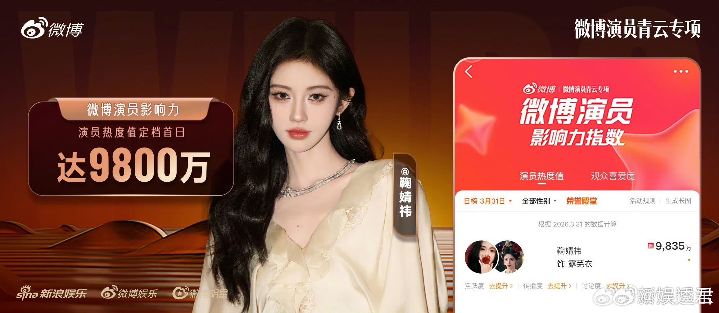鞠婧祎待播剧角色热度断层第一 露芜衣这一角色简直为鞠婧祎量身定做,剧未播热度便已跃居各大平台榜首,热度值突破9800万,她的魅力让人无法抗拒!