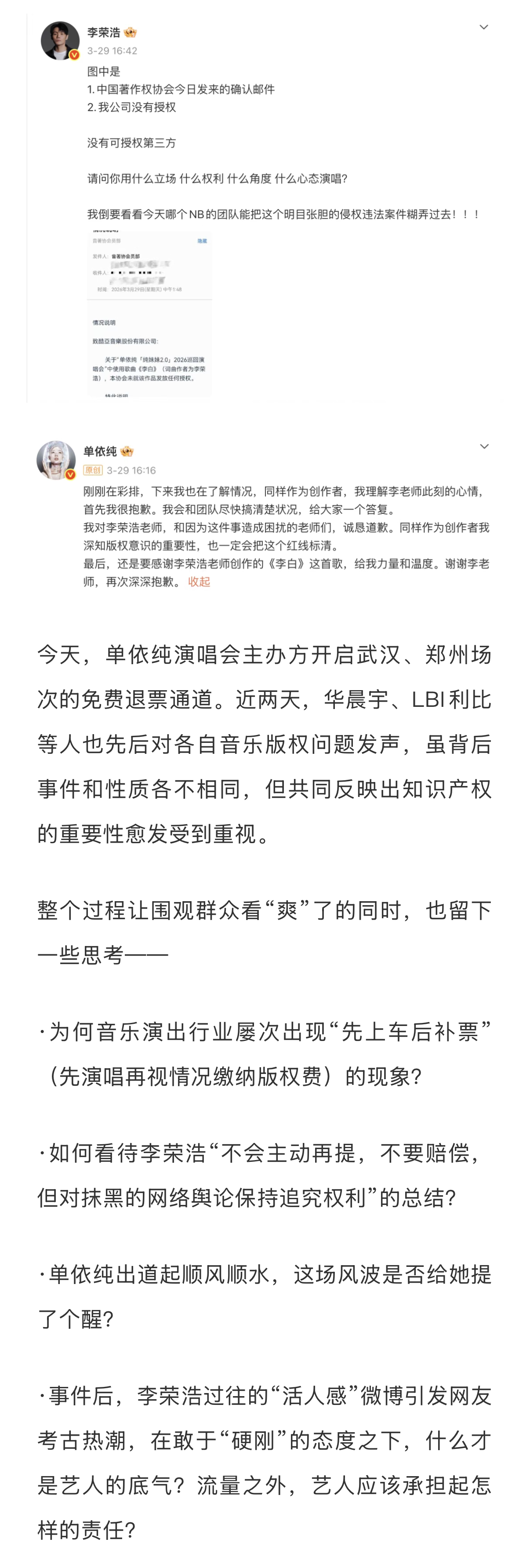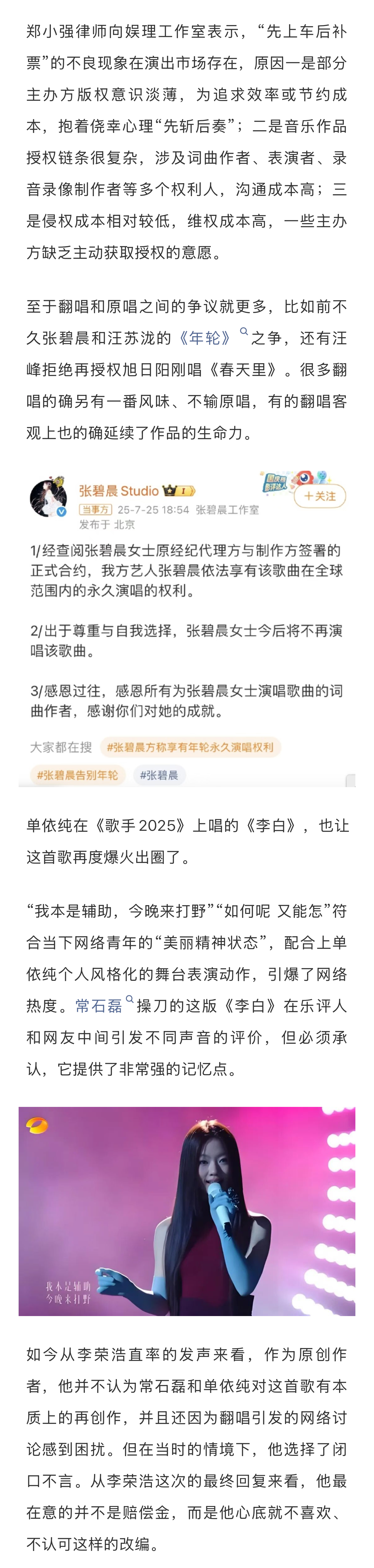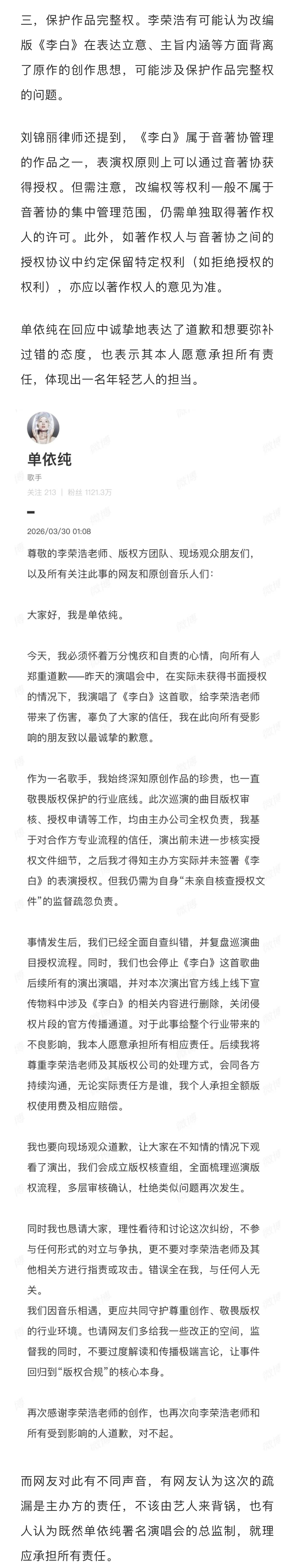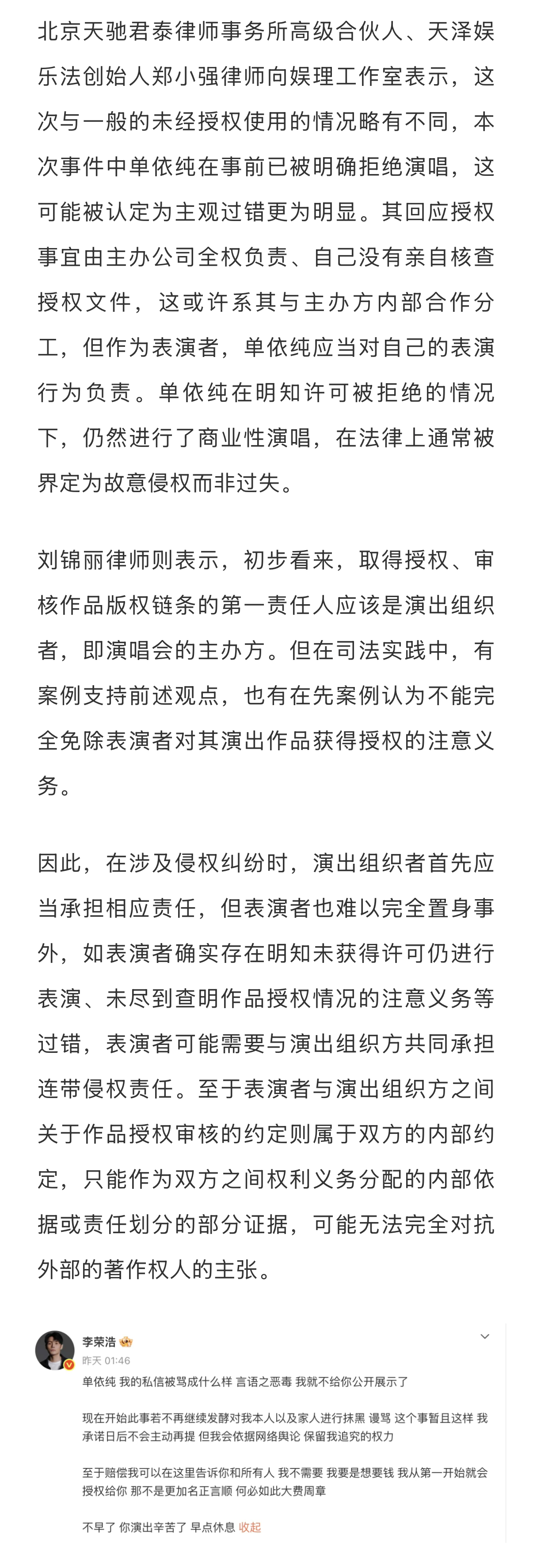 律师称音乐维权成本高于侵权成本音乐版权先上车后补票现象 李荣浩公开发文喊话单依纯,打响了维权之战的第一枪。整个过程让围观群众看“爽”了的同时,也留下一些思考——为何音乐演出行业屡次出现“先上车后补票”(先演唱再视情况缴纳版权费)的现象?如何看待李荣浩“不会主动再提,不要赔偿,但对抹黑的网络舆论保持追究权利”的总结?单依纯出道起顺风顺水,这场风波是否给她提了个醒?事件后,李荣浩过往的“活人感”微博引发网友考古热潮,在敢于“硬刚”的态度之下,什么才是艺人的底气?流量之外,艺人应该承担起怎样的责任?新浪娱乐工作室咨询多位律师,详细内容请戳...娱理独家↓