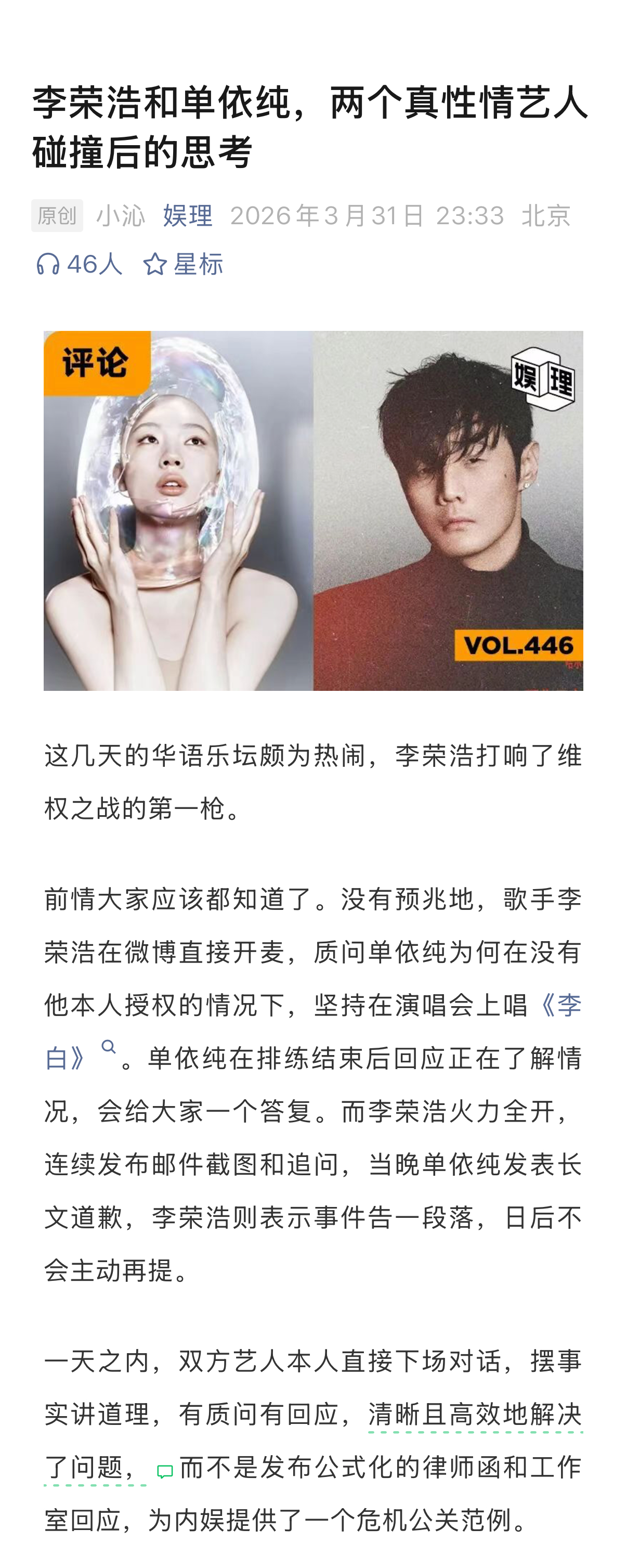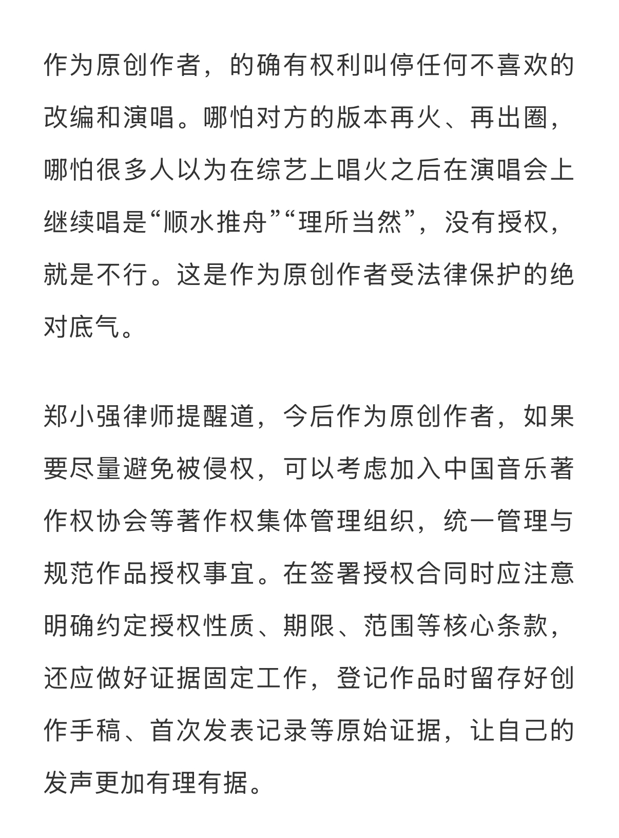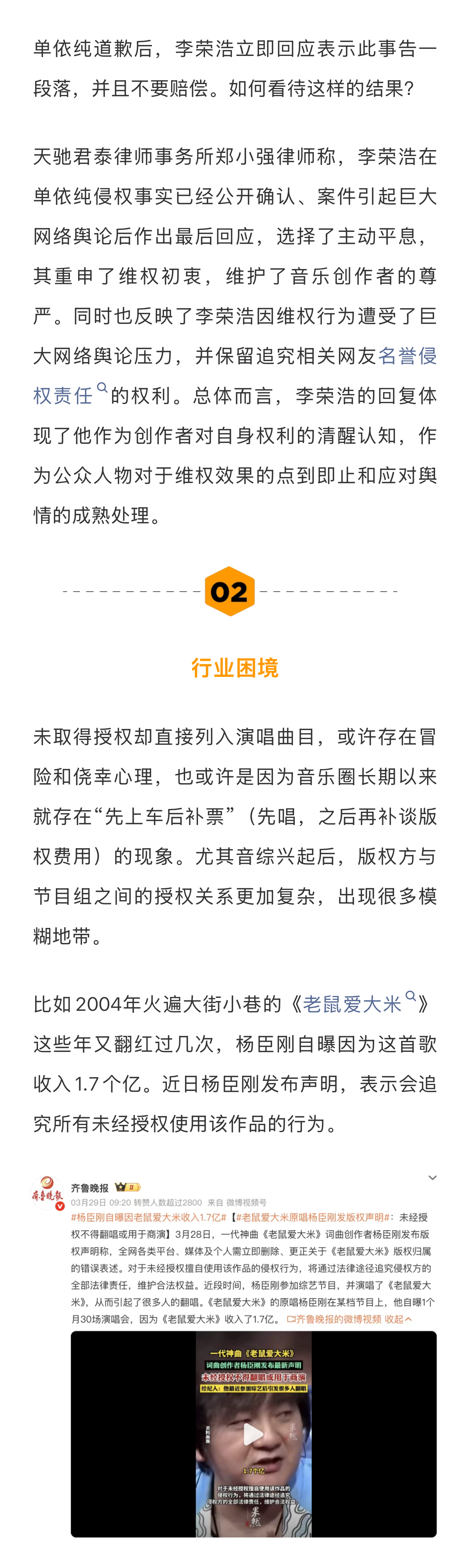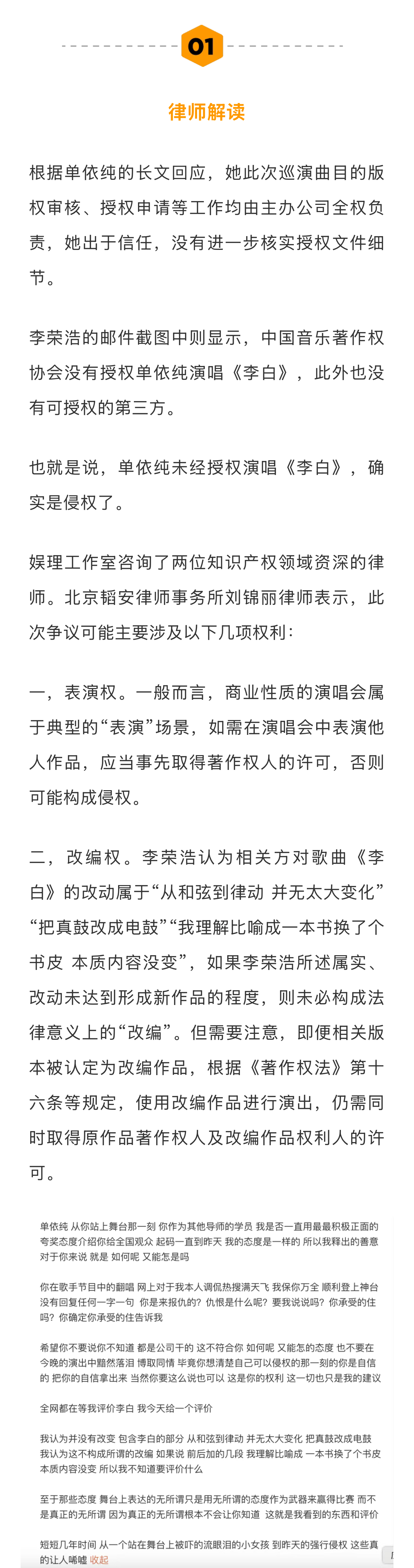 律师称音乐维权成本高于侵权成本音乐版权先上车后补票现象 李荣浩公开发文喊话单依纯,打响了维权之战的第一枪。整个过程让围观群众看“爽”了的同时,也留下一些思考——为何音乐演出行业屡次出现“先上车后补票”(先演唱再视情况缴纳版权费)的现象?如何看待李荣浩“不会主动再提,不要赔偿,但对抹黑的网络舆论保持追究权利”的总结?单依纯出道起顺风顺水,这场风波是否给她提了个醒?事件后,李荣浩过往的“活人感”微博引发网友考古热潮,在敢于“硬刚”的态度之下,什么才是艺人的底气?流量之外,艺人应该承担起怎样的责任?新浪娱乐工作室咨询多位律师,详细内容请戳...娱理独家↓