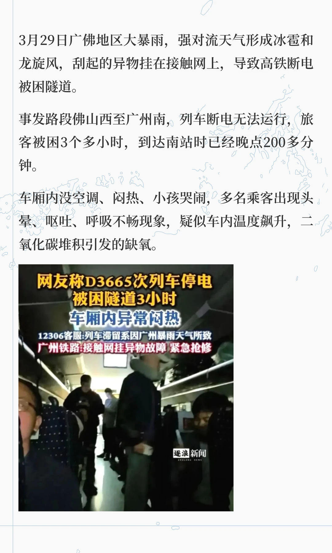 广佛强降雨+暴风,列车断电被困隧道3小时