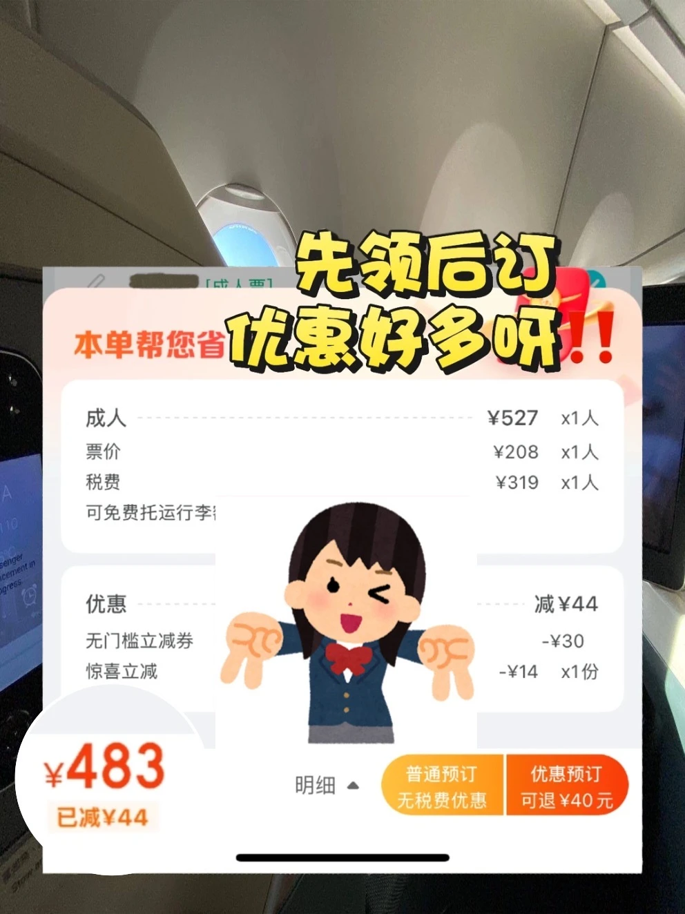 在去哪儿领了机票优惠券后,一趟国际航班直接省了100💰块!感觉像捡漏了一样~