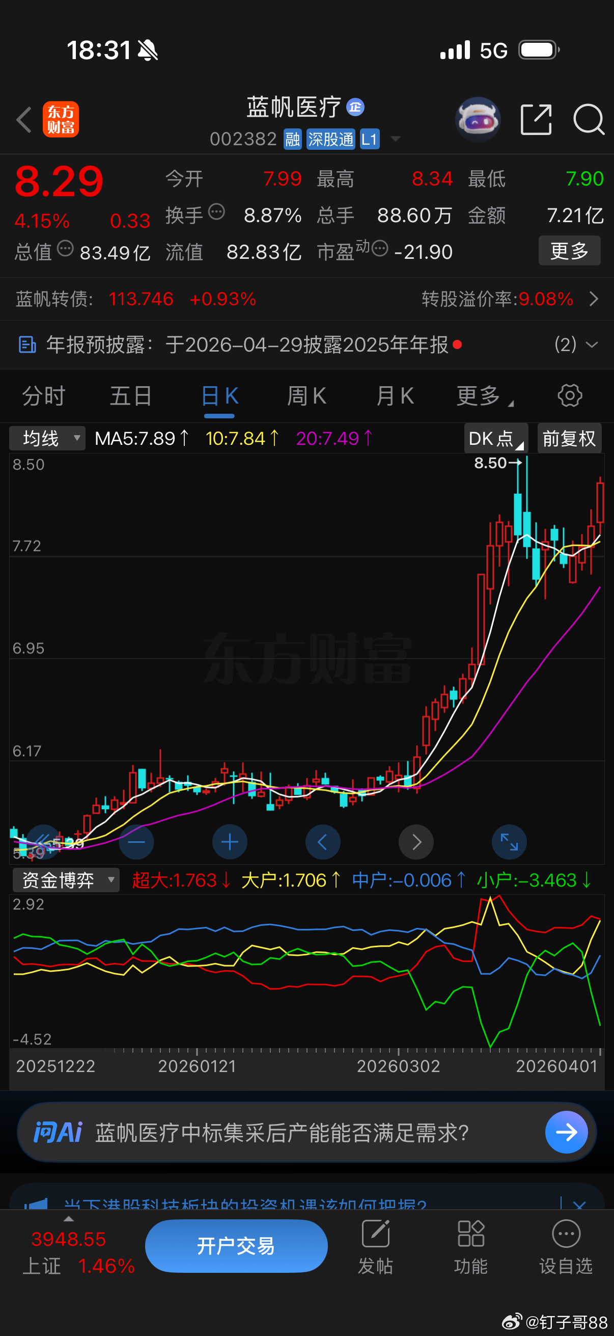 此股尾盘有人抢筹?从集合竞价看呈现阶梯式放量上升状态。全天分时上下震荡幅度也不小,上午开盘急拉后下砸,下午拉升一段后又下砸,尾盘再拉起来,最后三分钟,量价齐升。这个蓝帆医疗,日线级别看,不太规则的上升三角形结构,今天略有突破,还不是真正意义上的突破,明天是比较关键的一天,是涨停,还是再回踩,就看操盘手技术了。感觉这个操盘手技术不太行,有点磨磨唧唧的。不知道各位高手怎么看?