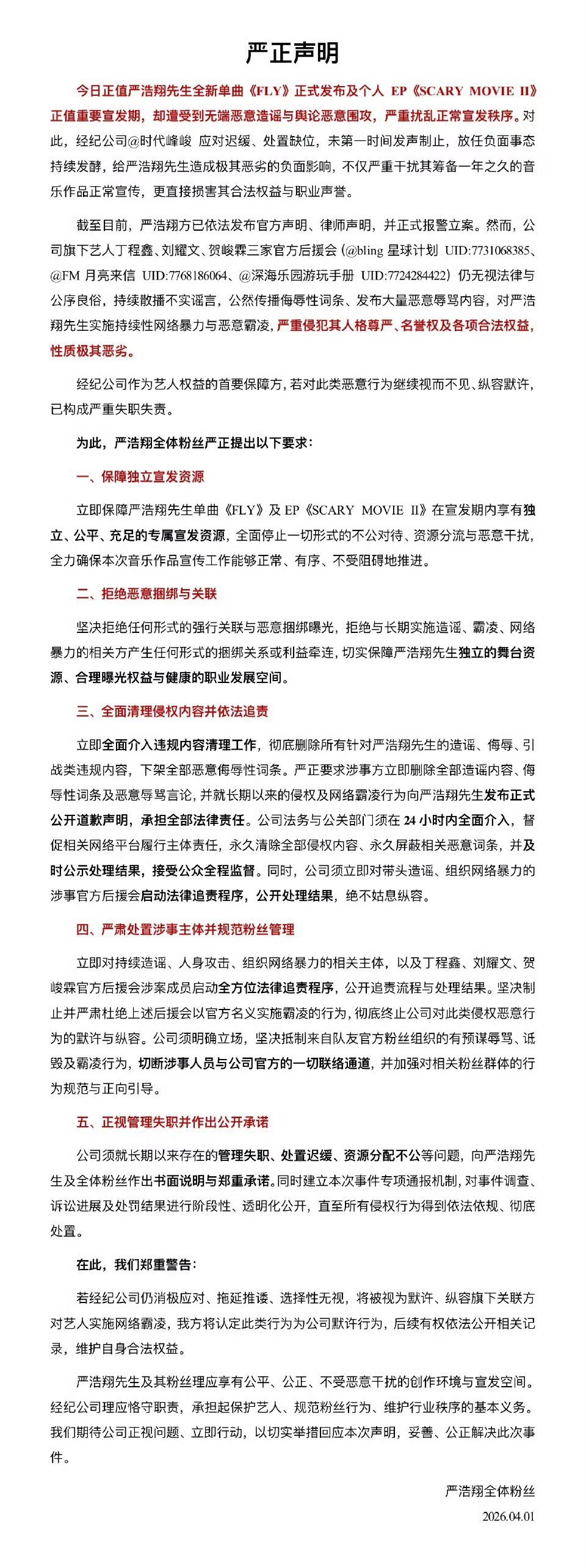 严浩翔后援会声明严浩翔后援会发布长文,控诉其在新单《FLY》宣发期遭遇恶意造谣,还点名丁程鑫、刘耀文、贺峻霖三家后援会涉网络霸凌。随后提出五项严正交涉,要求公司保障宣发资源、清理侵权言论并追责,还得规范粉丝管理、回应管理失职问题。