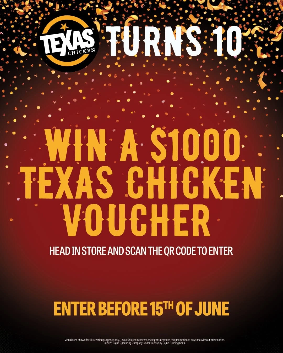 🎁 在店内消费即可参与抽奖,赢取价值 1000 美元的 Texas Chicken 礼券[超喜欢R][超喜欢R]