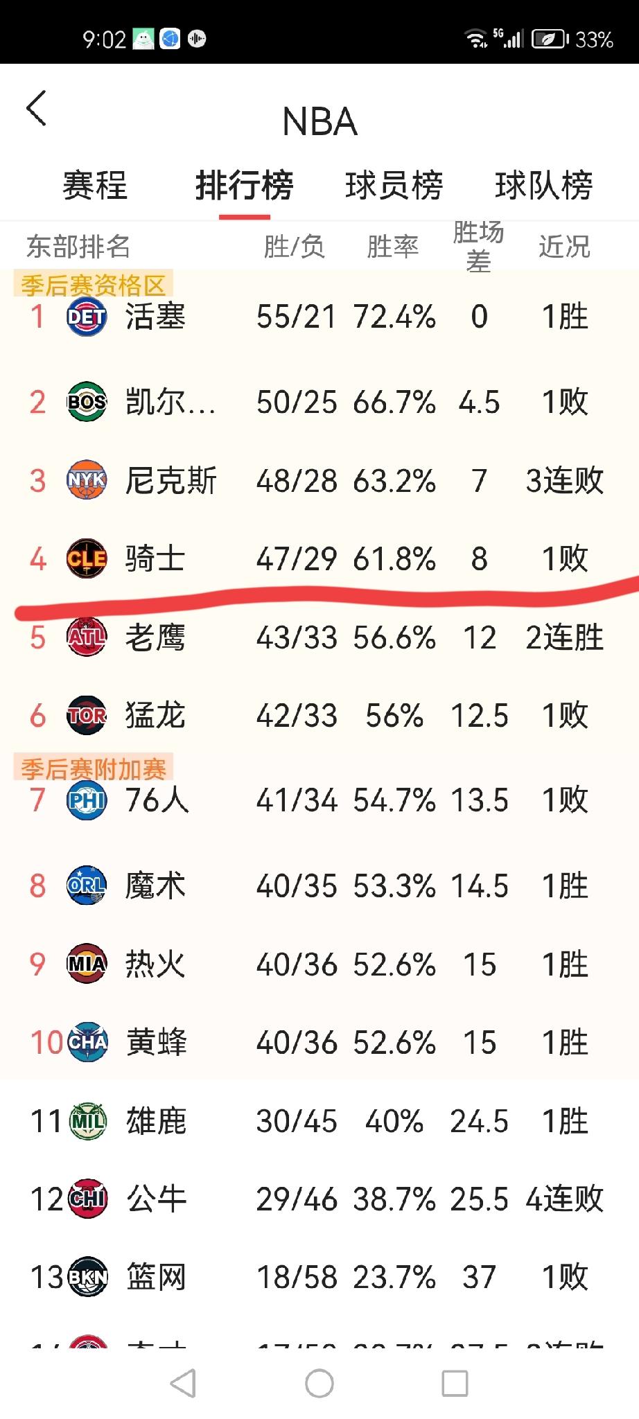 东部第三的尼克斯与第四的骑士仅有1个胜场差,且尼克斯手握交手战绩优势。