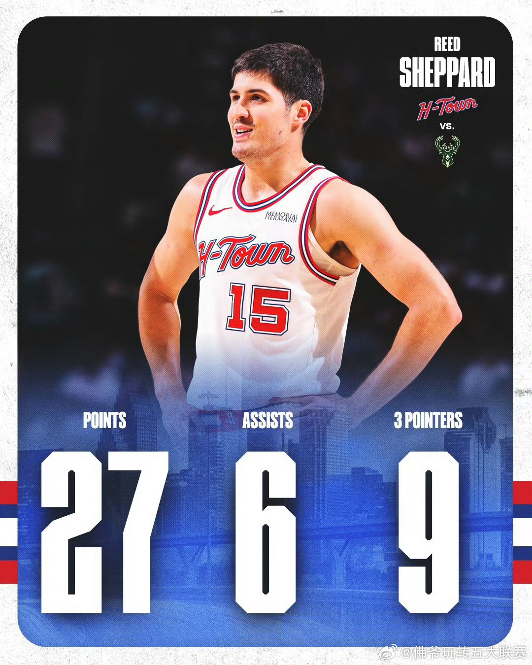 9记三分轰生涯新高!谢泼德27+6率火箭擒雄鹿,21岁新星成历史第五年轻9+三分先生
