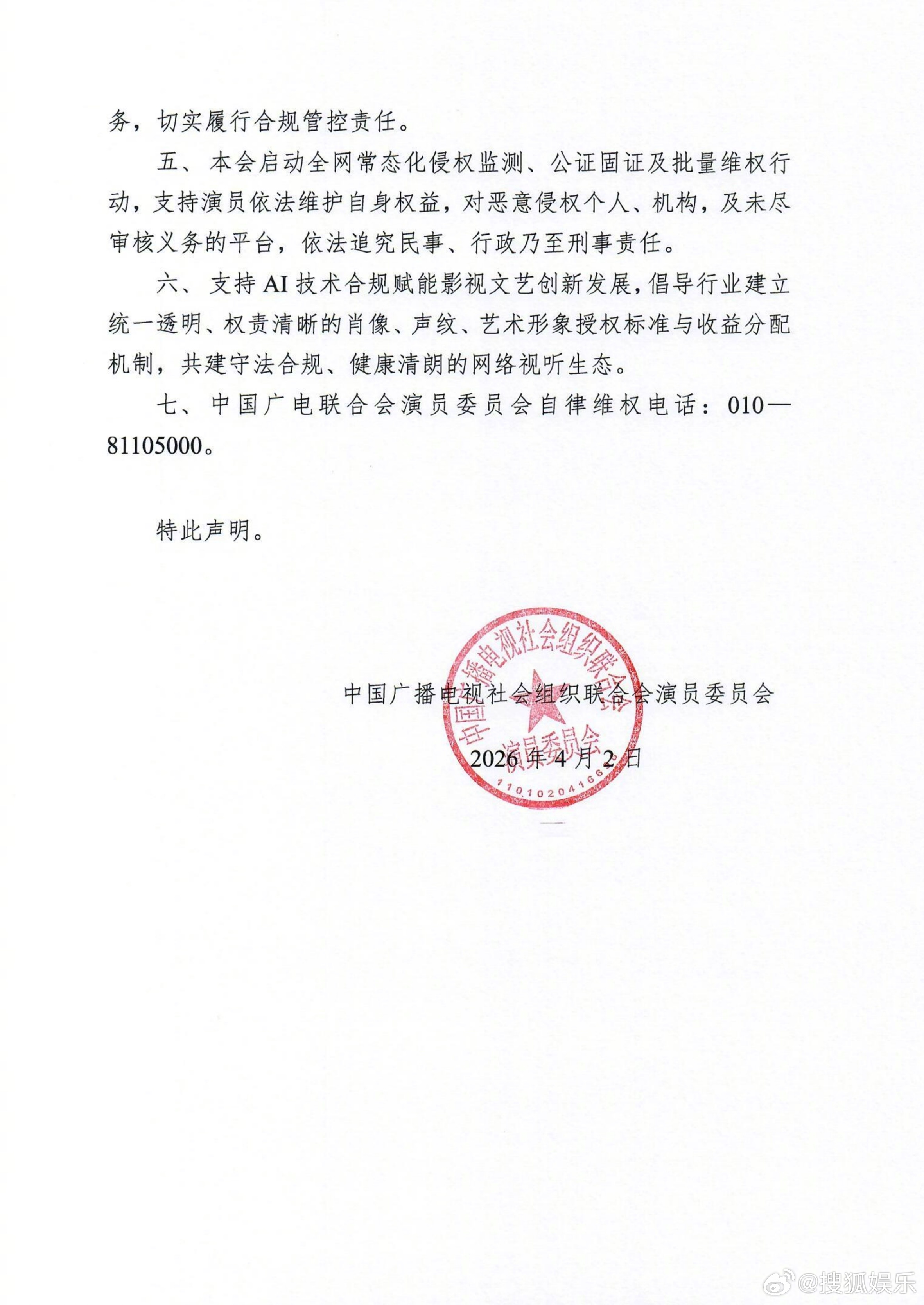 中国广电联合会演员委员会关于AI侵权声明今日,中国广电联合会演员委员会就当前AI侵权发布声明。 声明称,演艺人员享有肖像权、声音权、艺术形象权等人格权益,任何主体未经本人书面正式授权,严禁擅自采集、使用、合成、传播相关影像、声纹与专属艺术形象。