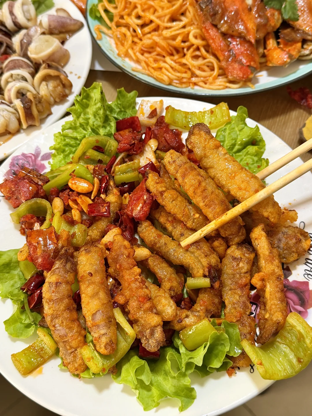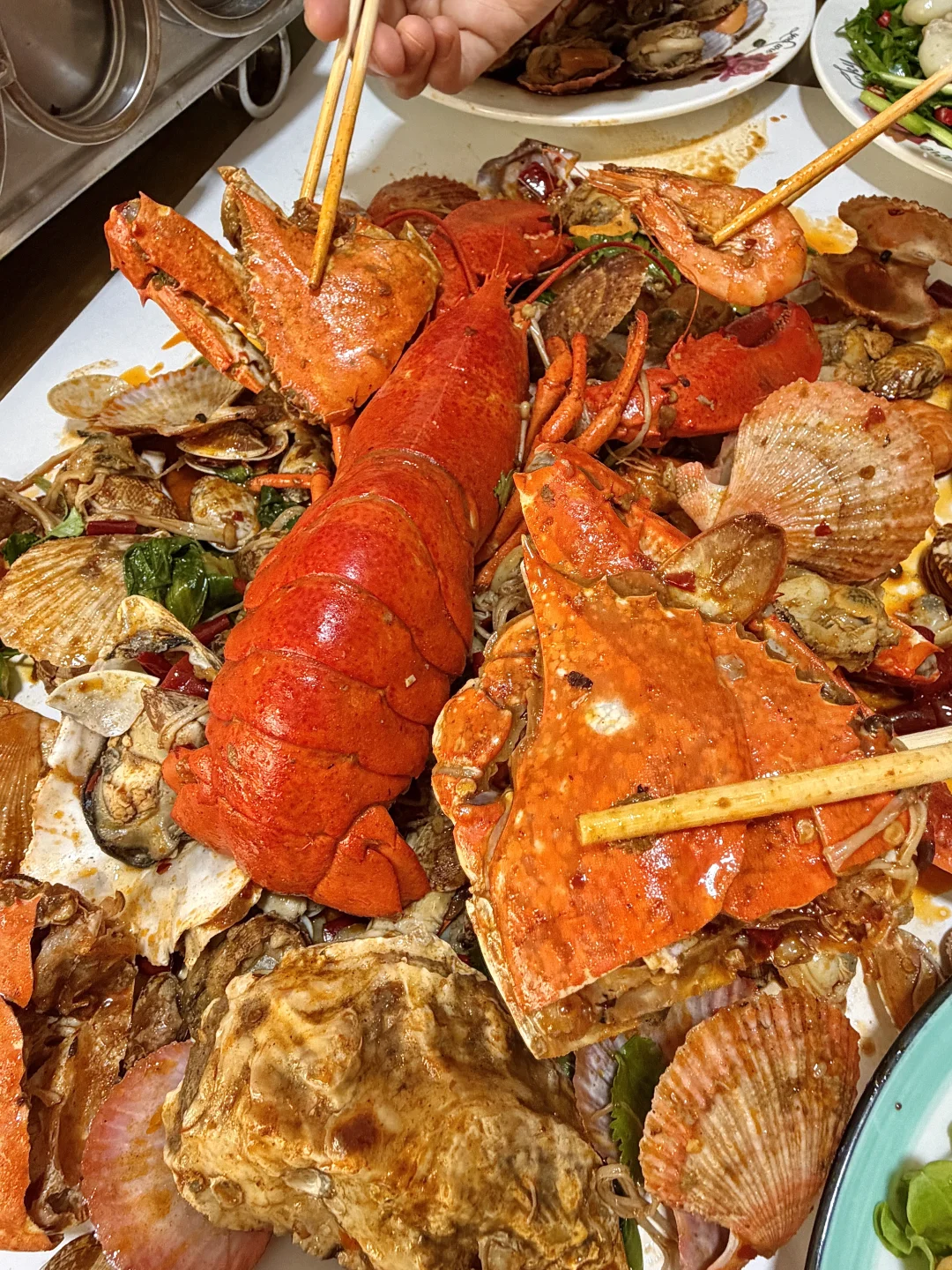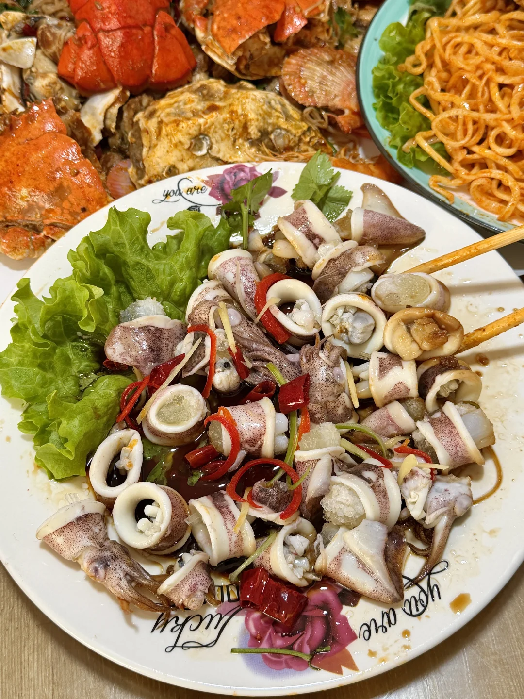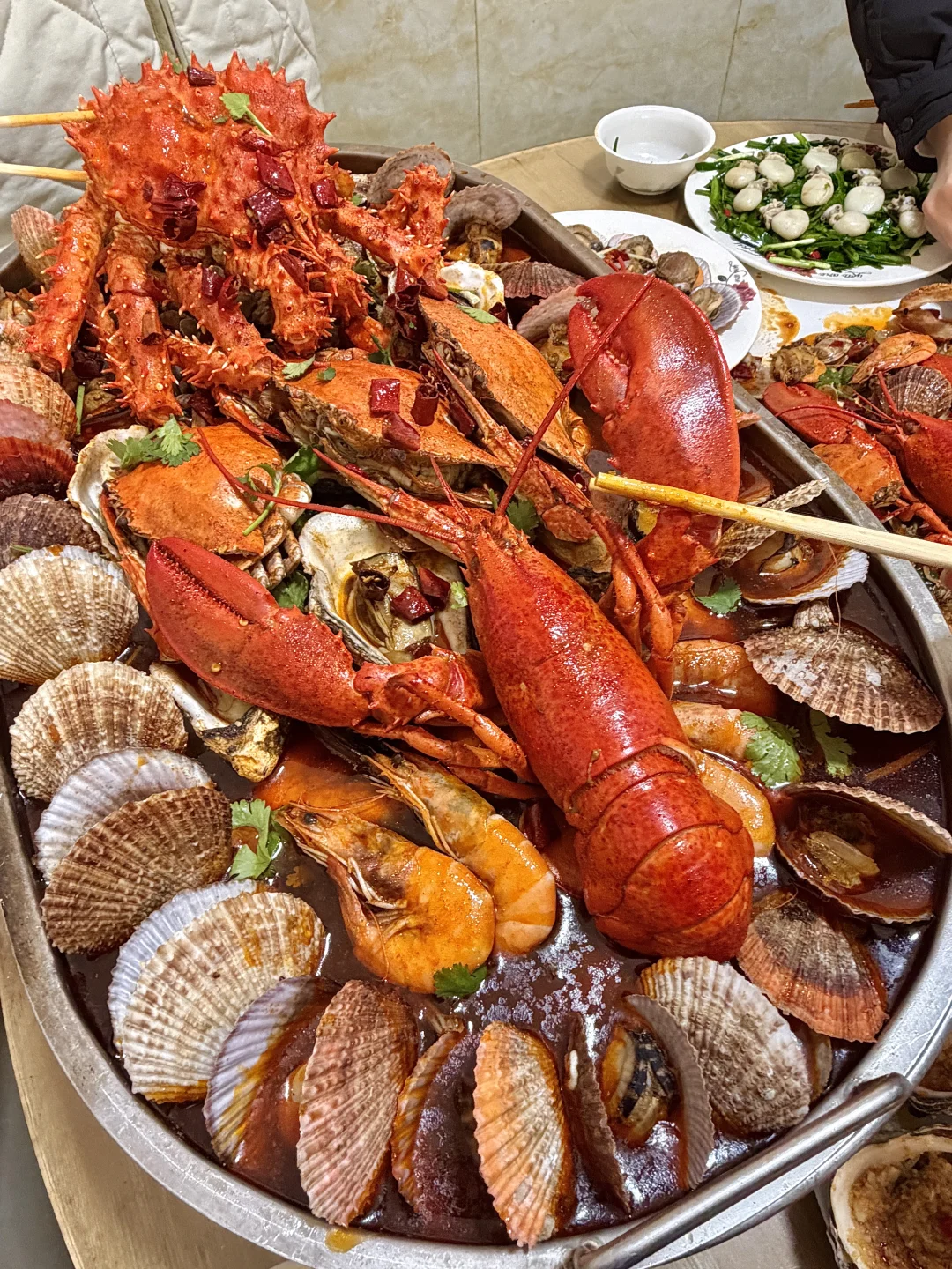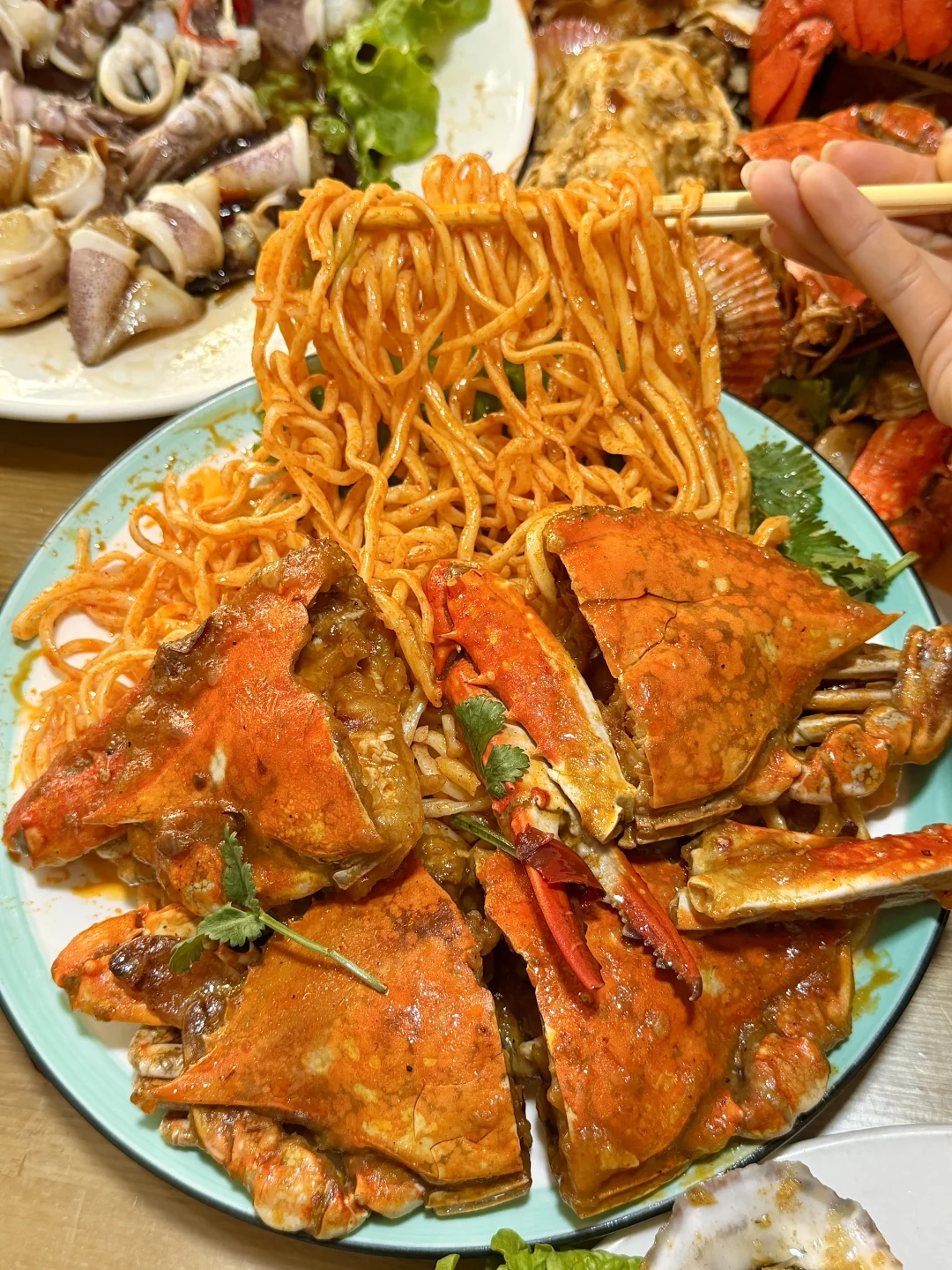 正宗老青岛口味!海鲜大咖满满一大盆都是料,真的巨巨好吃,还有香辣蟹拌面、油泼笔管、乌鱼籽炒韭菜等..每道菜都很下饭!!
