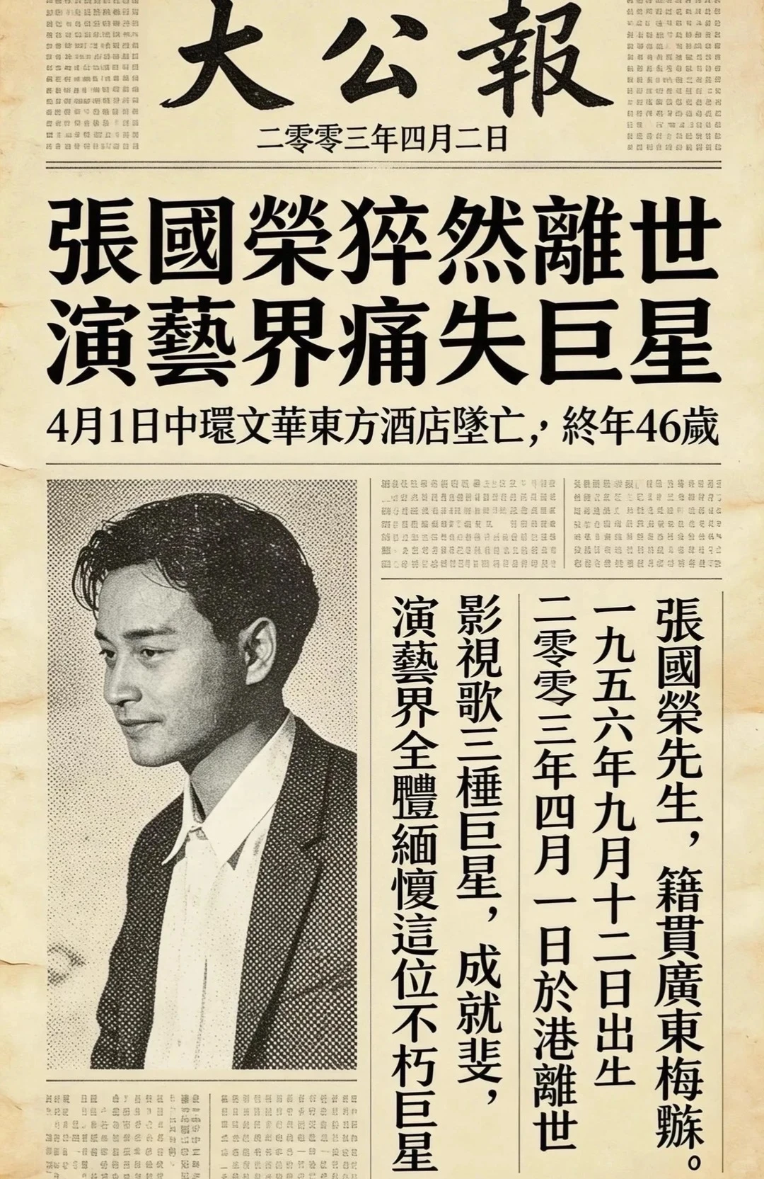 (1956 年 9 月 12 日,张国荣出生于香港九龙,却在 2003 年 4 月 1 日这天,永远离开了我们,年仅 46 岁。)