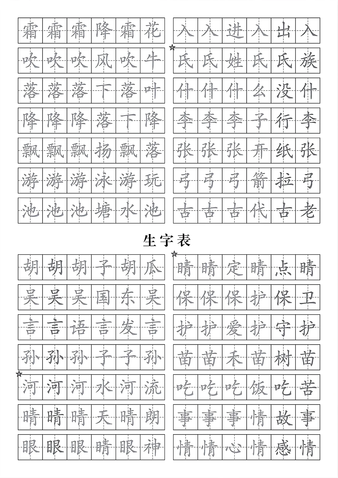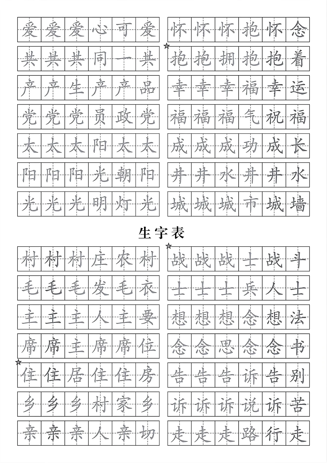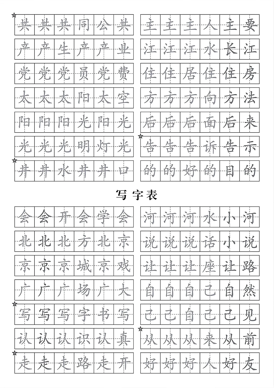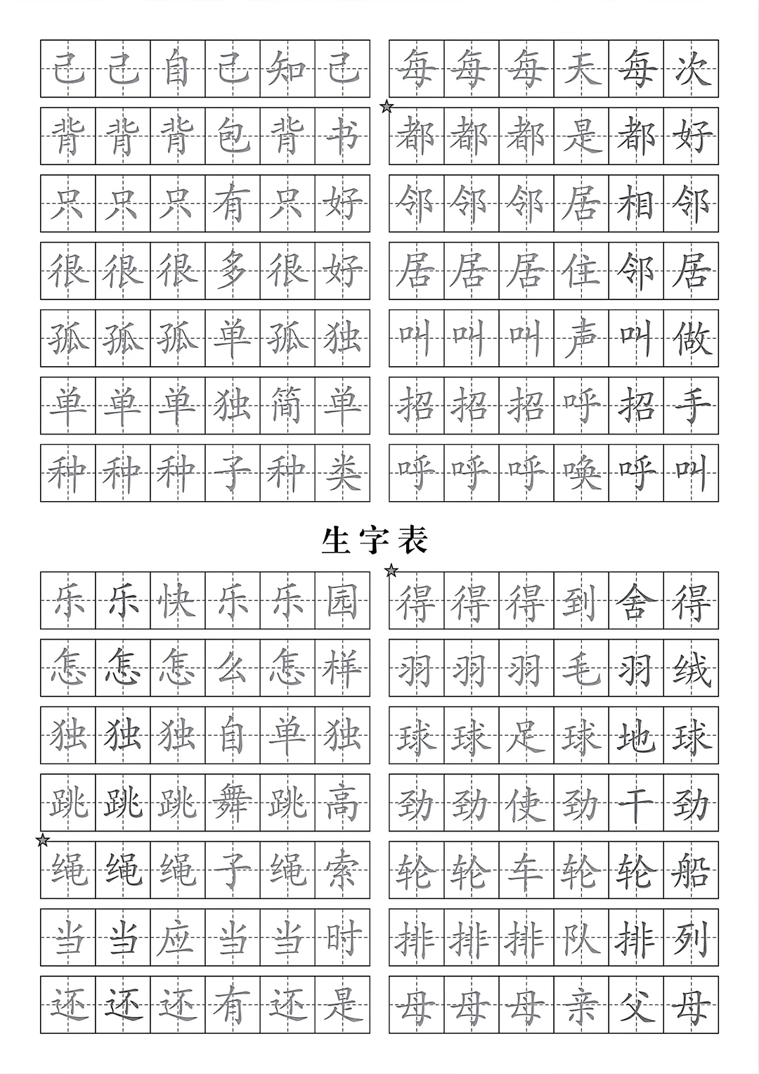 共23页,自制的一份字帖,主要是为了让孩子练一下字,练字的过程顺便把生字表,写字表多记记,然后还有组词也是作业里面需要的