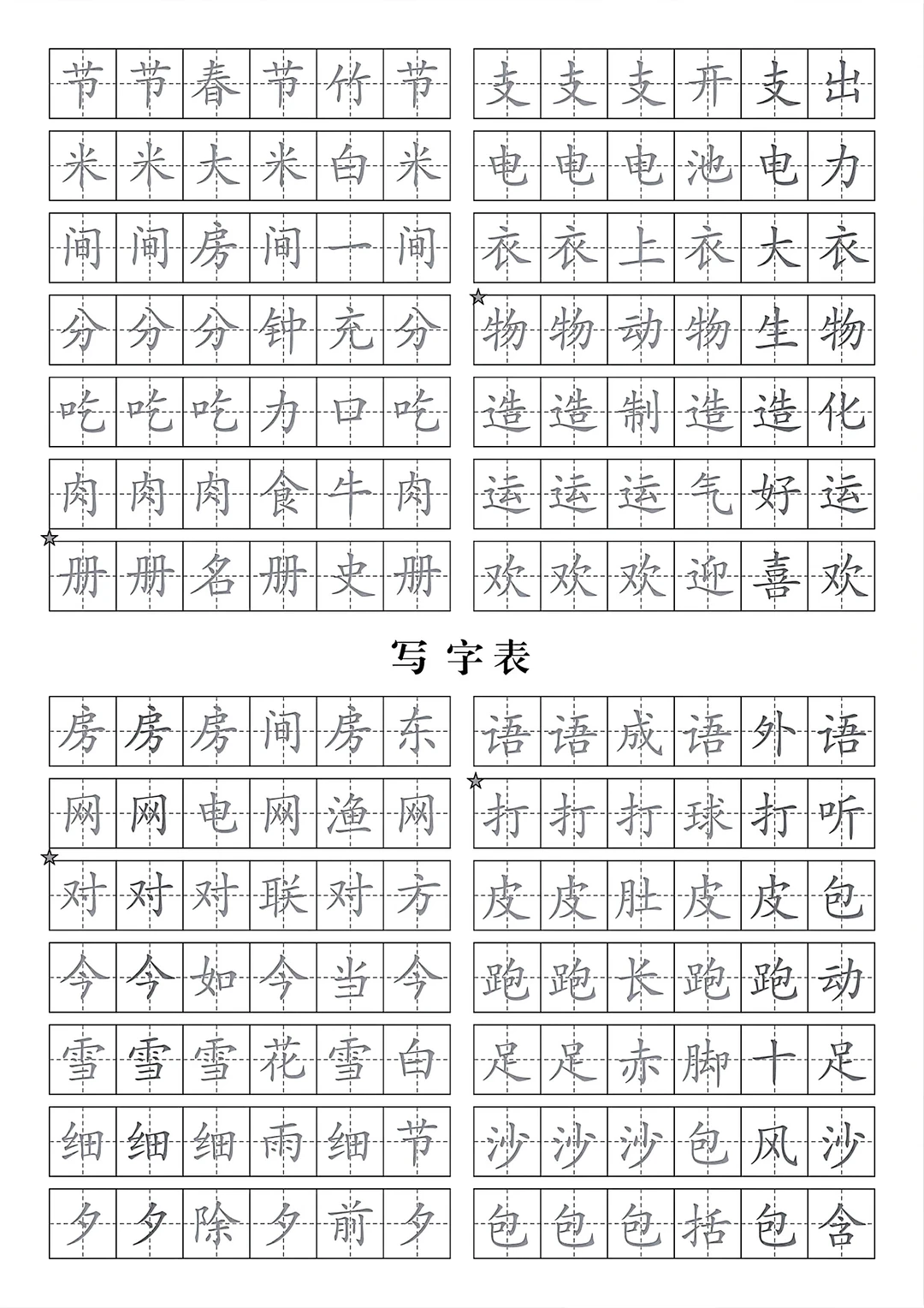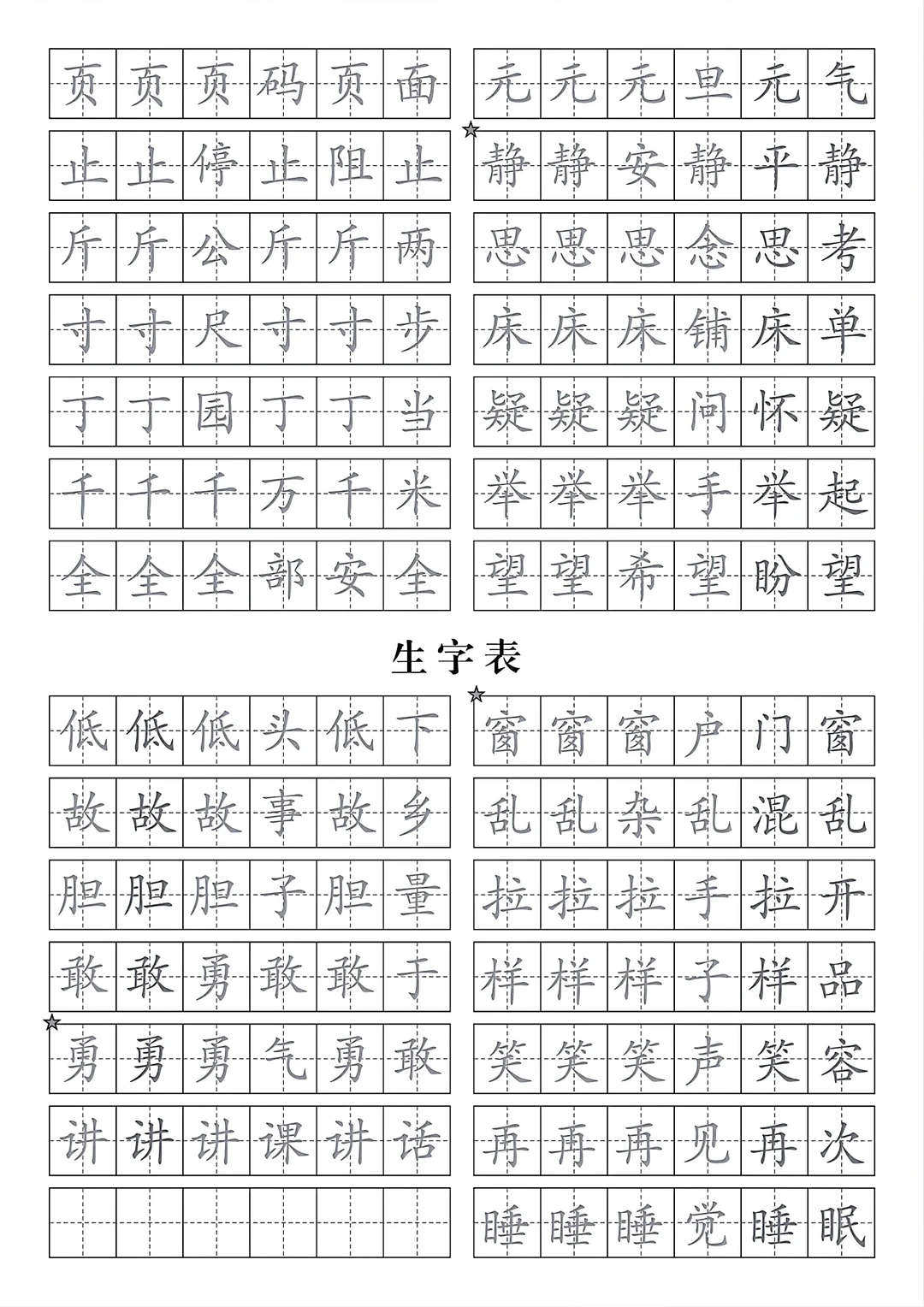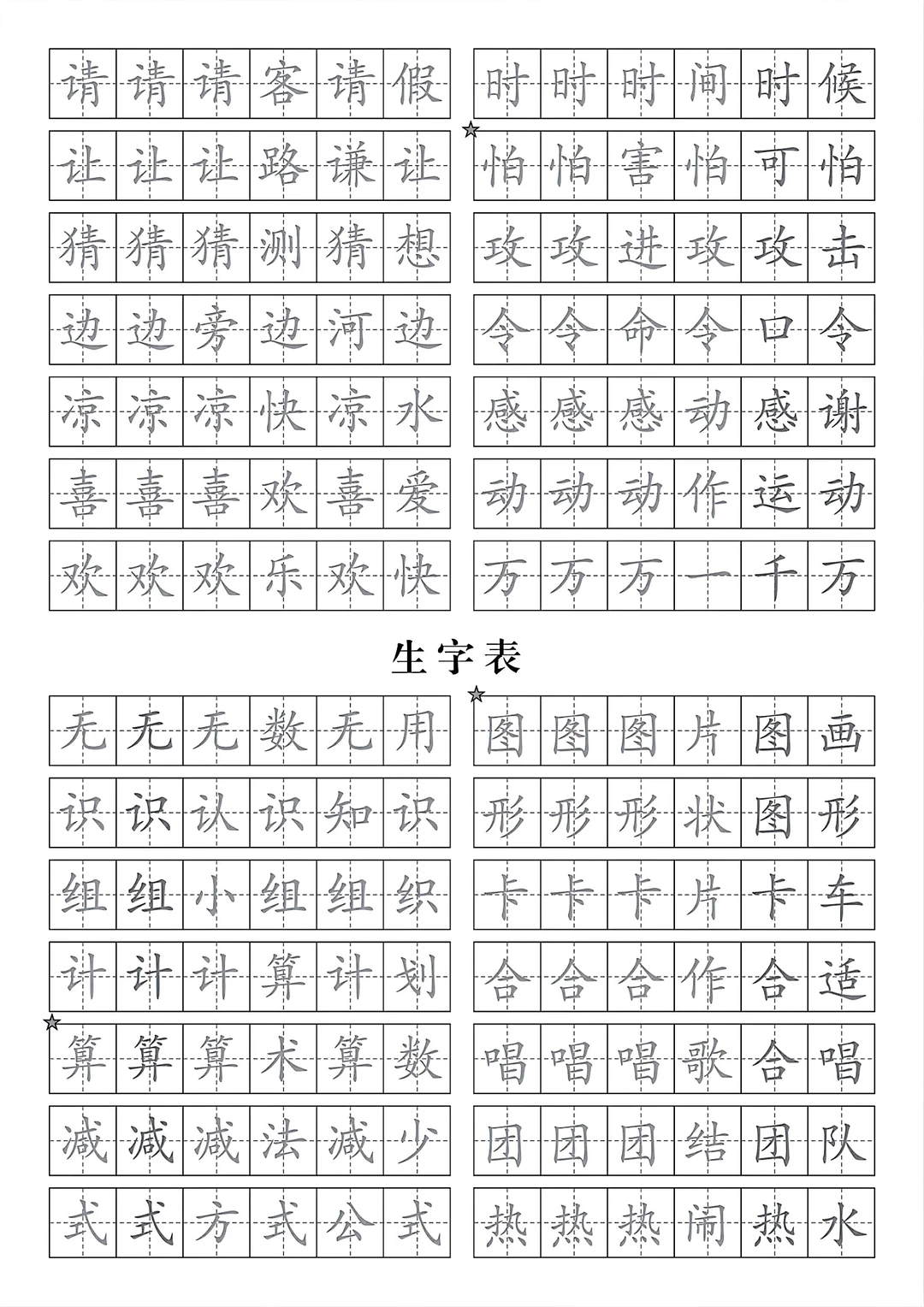 共23页,自制的一份字帖,主要是为了让孩子练一下字,练字的过程顺便把生字表,写字表多记记,然后还有组词也是作业里面需要的