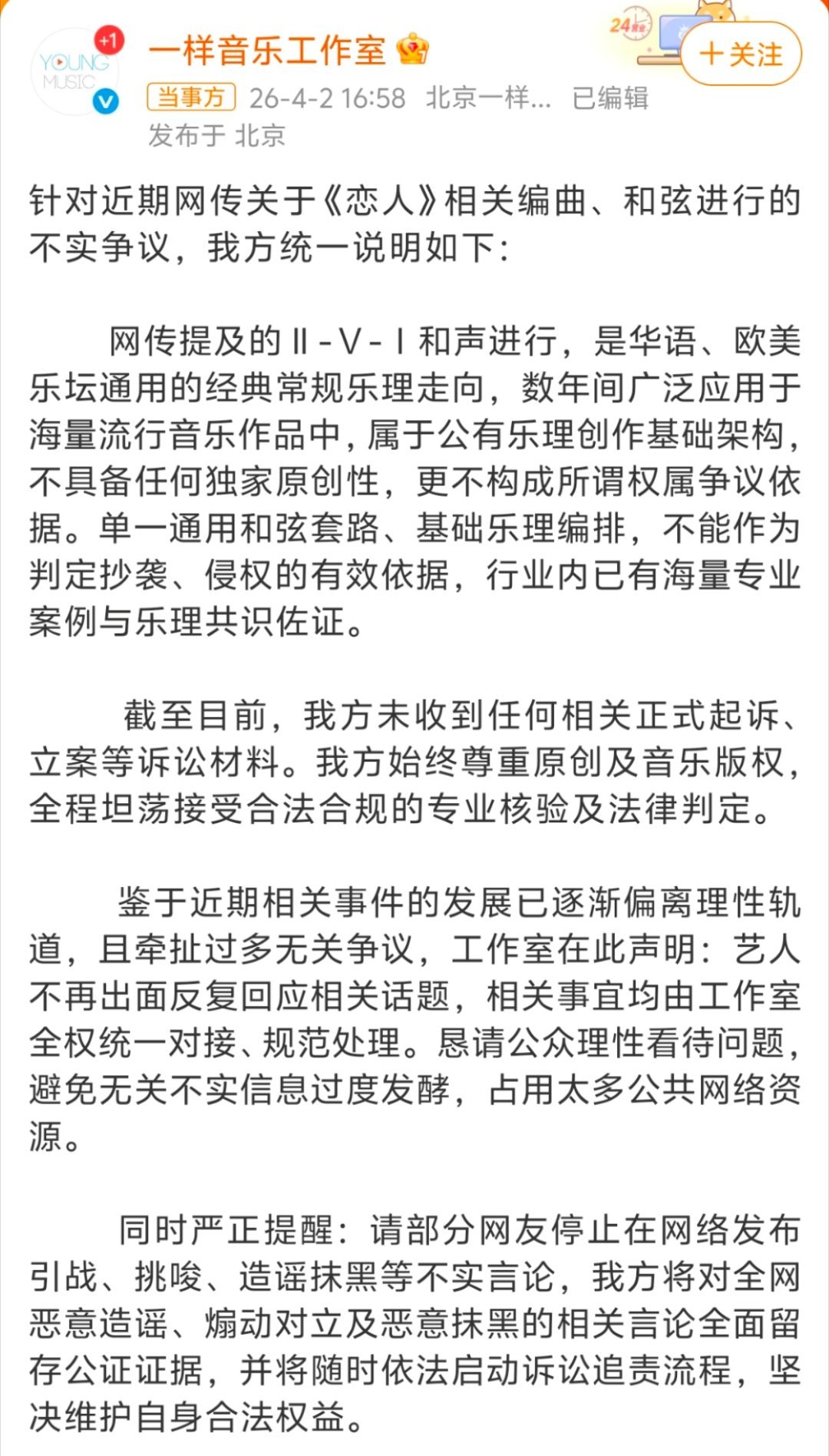李荣浩方否认恋人抄袭最近李荣浩的《恋人》被美籍音乐人Dennis Kuo指控编曲抄袭。4月2日工作室发声明回应,说争议部分是通用的II-V-I经典和弦走向,属于公有乐理,不算侵权,还表示会依法追责造谣言论,也愿意接受专业核验,目前没收到正式起诉。