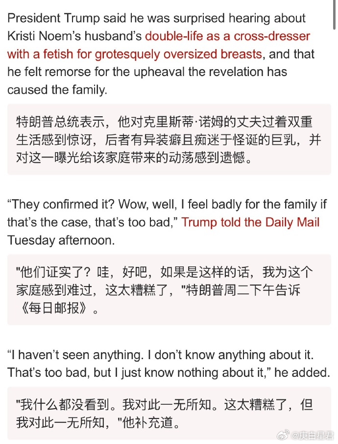 LGBT的受害者不止是孩子,大人都无法幸,甚至是有权有势的大人:这妞看着是不是眼熟?特朗普任命的美国国土安全部的部长克里斯蒂·诺姆,上月这妞因卷入腐败丑闻和公开甩锅特朗普被特朗普开了,这妞此前被美国媒体追到和她的下属莱万多斯基搞婚外情,彼时大家还嘲笑妞胆太大玩儿的花,结果,昨天美国《纽约邮报》、英国《每日邮报》同时报道称: