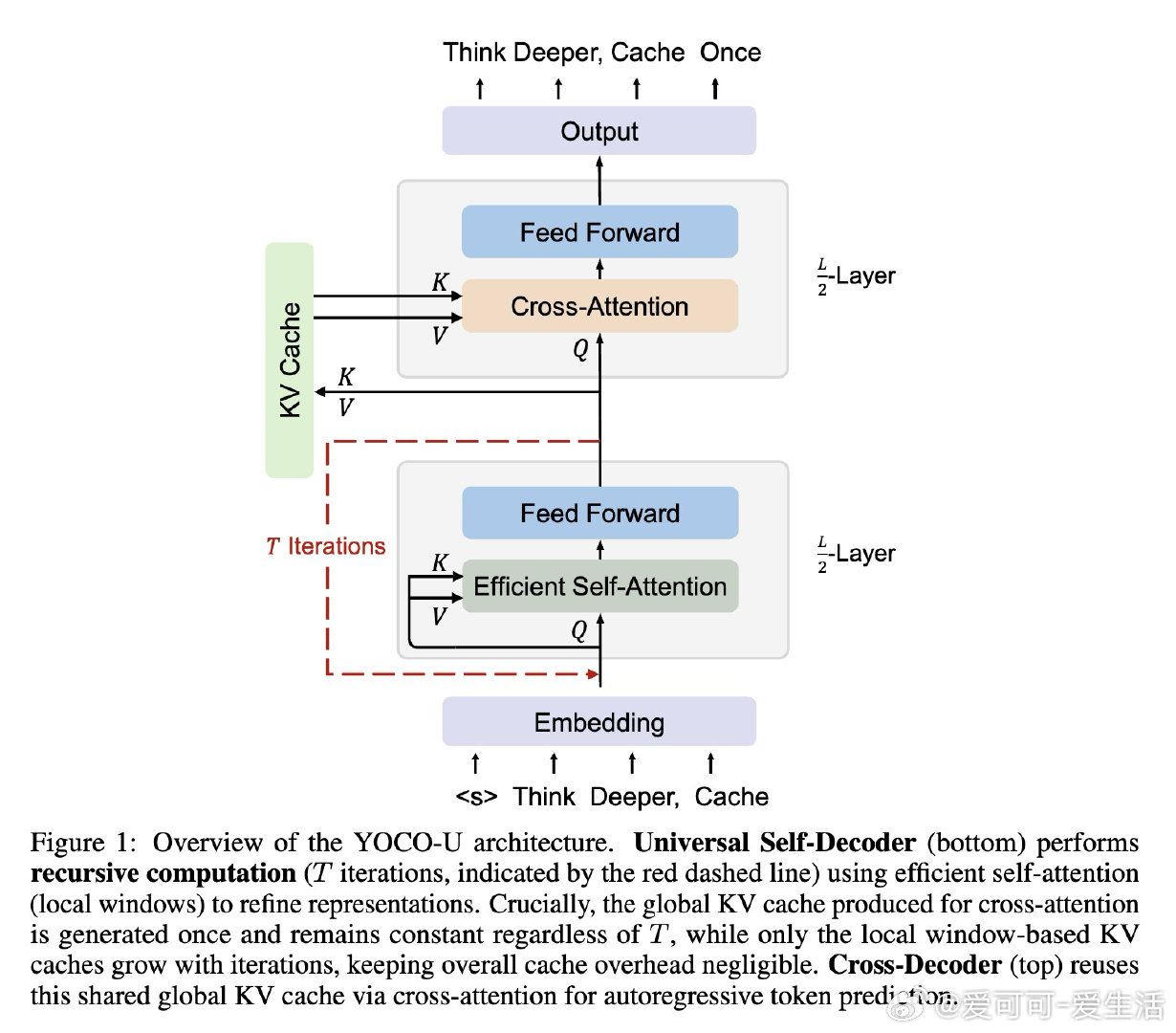 本文的核心洞见是:把"需要循环的层"和"需要全局记忆的层"重新看作两个可分离的功能模块。由此,将递归迭代限制在仅使用滑动窗口注意力的浅层Self-Decoder、而非整个网络,这一关键操作使问题得以解开——循环带来表达深度,全局KV缓存只生成一次且与迭代次数无关,两者互不干扰。