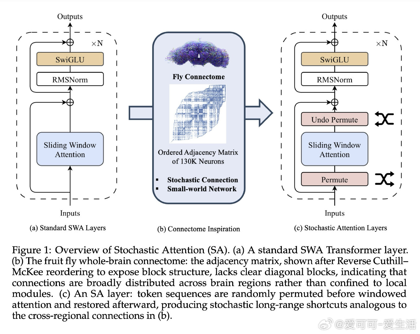本文的核心洞见是:把"固定邻居"重新看作"随机邻居"。在每层注意力计算前,对 token 序列施加一次独立均匀随机排列,窗口注意力结束后还原原序。这一操作使原本相距遥远的 token 以概率 w/n 成为彼此的局部邻居,每层独立采样的排列在深度方向产生指数级感受野扩张,仅需 O(log_w n) 层即可覆盖全序列,而非 SWA 所需的 O(n/w) 层。与 SWA 通过门控融合后,两者分别扮演果蝇连接组中"密集局部聚类"与"分布式长程捷径"的角色,精确复现了小世界网络拓扑。