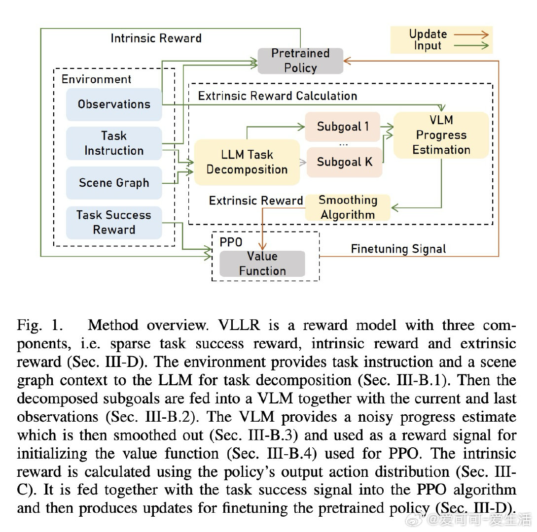 本文的核心洞见是:把"如何奖励机器人"重新看作"如何从已有知识中挖掘两类互补信号"。由此,两个关键操作解开了这道难题:其一,用语言模型将任务分解为可视觉验证的子目标序列,再用视觉语言模型评估子目标完成度,但仅在训练初期的价值函数预热阶段调用,而非每步查询,将推理成本压缩至可接受范围;其二,将策略自身动作分布的集中程度(自确信度)作为每步内在奖励——分布越尖锐,说明策略的隐式世界模型与当前状态越吻合,进而给予正向强化。