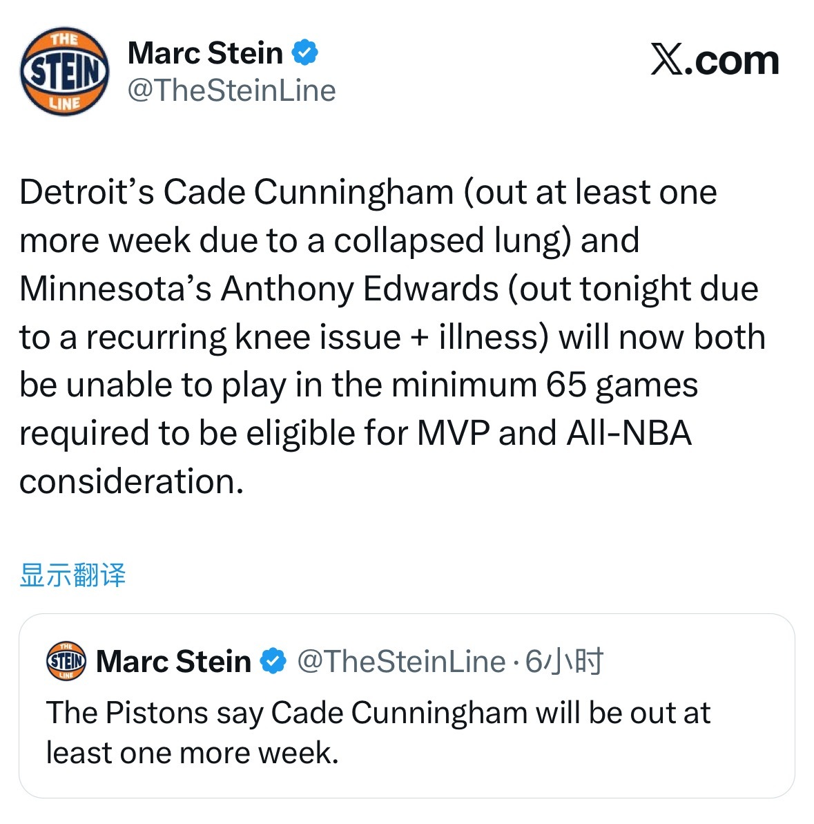 爱德华兹在对阵活塞的比赛中被确认缺阵后,已失去所有赛季末奖项的评选资格。坎宁安同样如此,至少还要缺席一周。