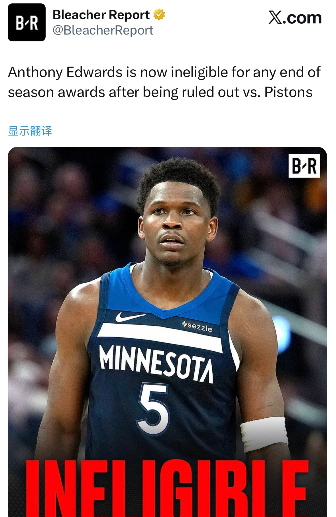 爱德华兹在对阵活塞的比赛中被确认缺阵后,已失去所有赛季末奖项的评选资格。坎宁安同