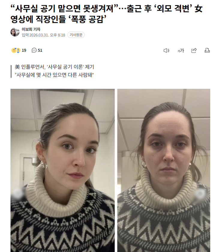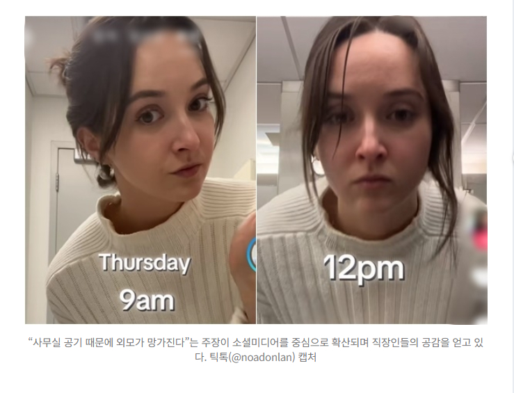 "因为办公室空气,外貌会变差"——这一主张以社交媒体为中心迅速扩散,引发了职场人的强烈共鸣。声称上班前还干净利落的脸庞,随着工作时间推移,会变得明显浮肿、显老。