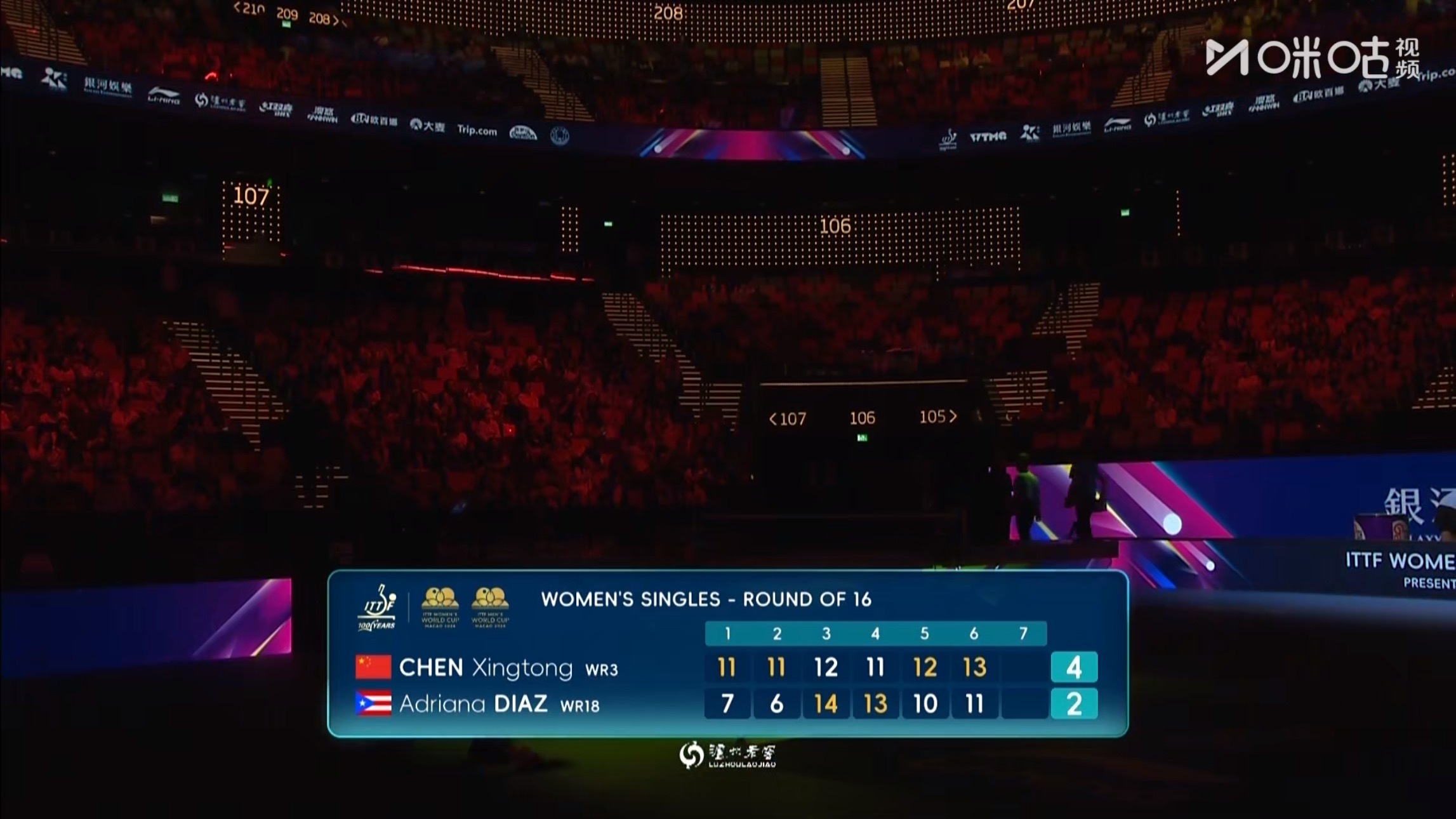 陈幸同4比2迪亚兹 乒乓球 (11-7,11-6,12-14,11-13,12-10,13-11)晋级澳门世界杯2026 女单8强