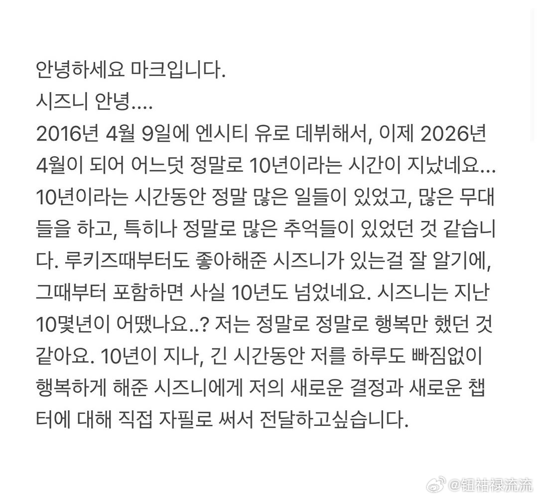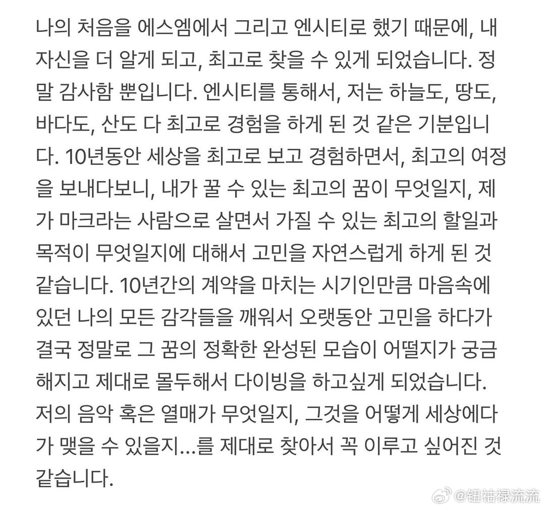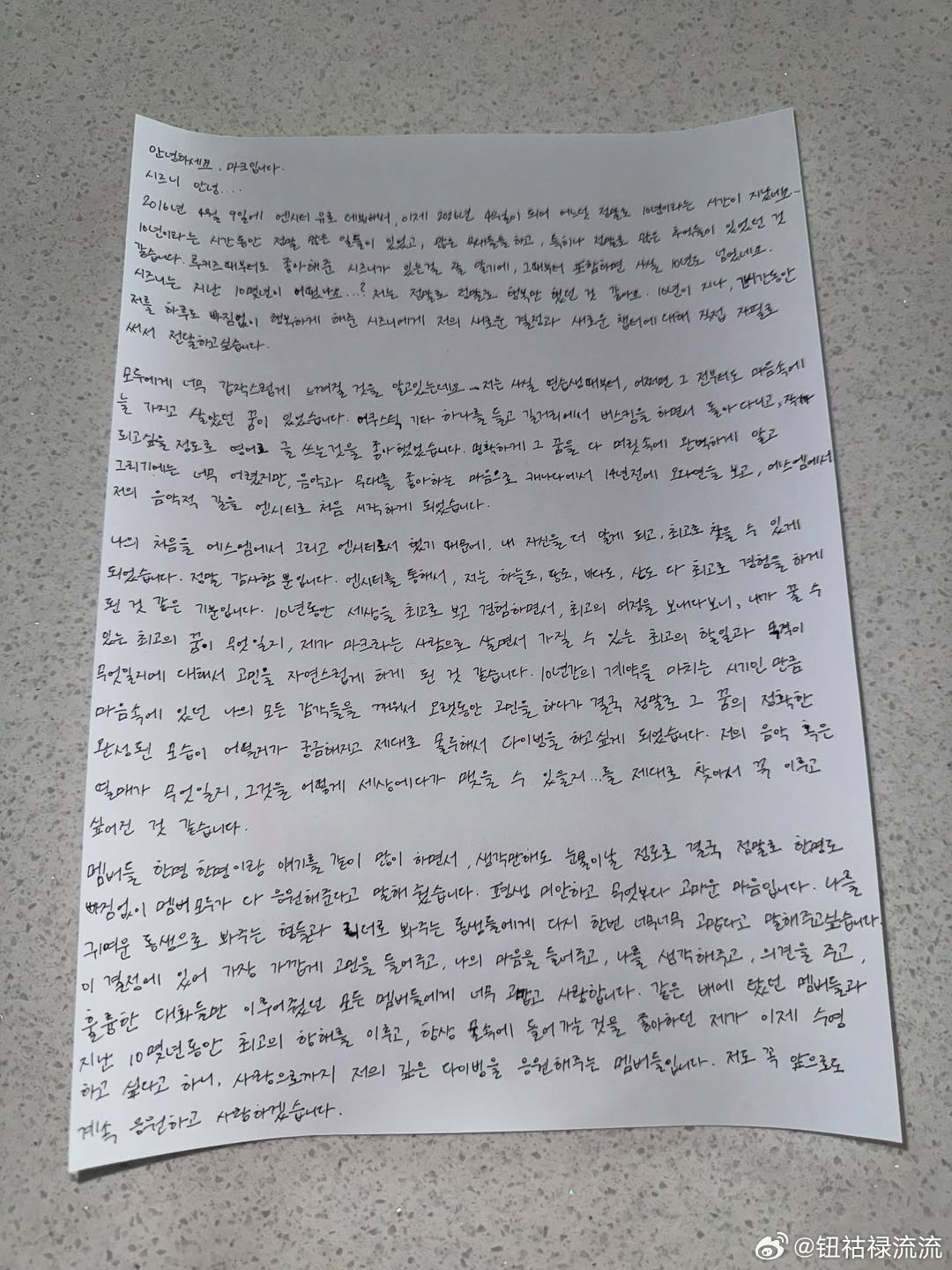 我想向所有西珍妮,以及一直以来了解我、支持我的所有人,表达我最深切、最真挚的感谢。真的非常非常感谢你们。……我会一生心怀对SM、NCT成员,以及西珍妮的感激之情。今后,当我以新的面貌向大家问候时,我会努力做到最好的自己,成为一个让大家看到美好一面的Mark,为此我会尽全力、全力以赴地努力。