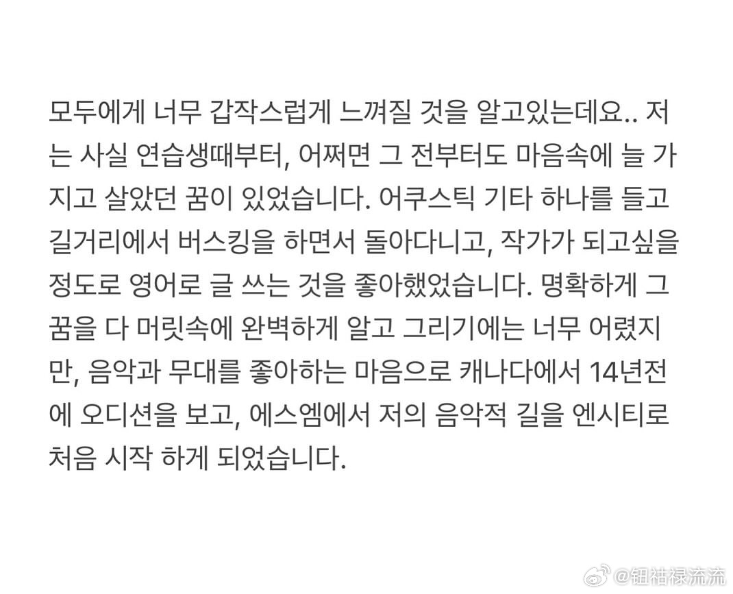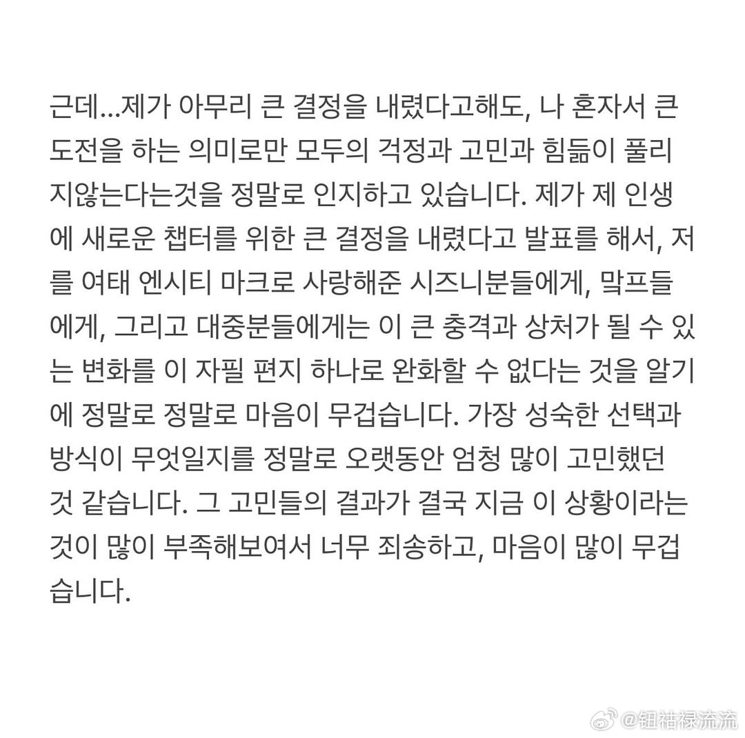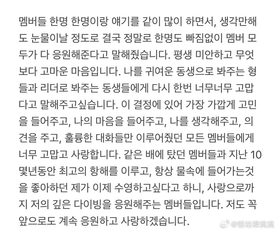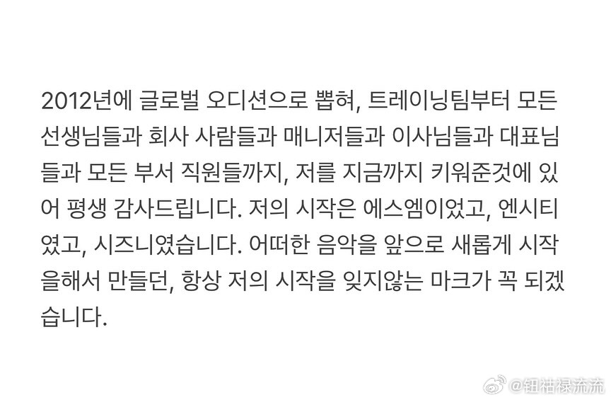 我想向所有西珍妮,以及一直以来了解我、支持我的所有人,表达我最深切、最真挚的感谢。真的非常非常感谢你们。……我会一生心怀对SM、NCT成员,以及西珍妮的感激之情。今后,当我以新的面貌向大家问候时,我会努力做到最好的自己,成为一个让大家看到美好一面的Mark,为此我会尽全力、全力以赴地努力。