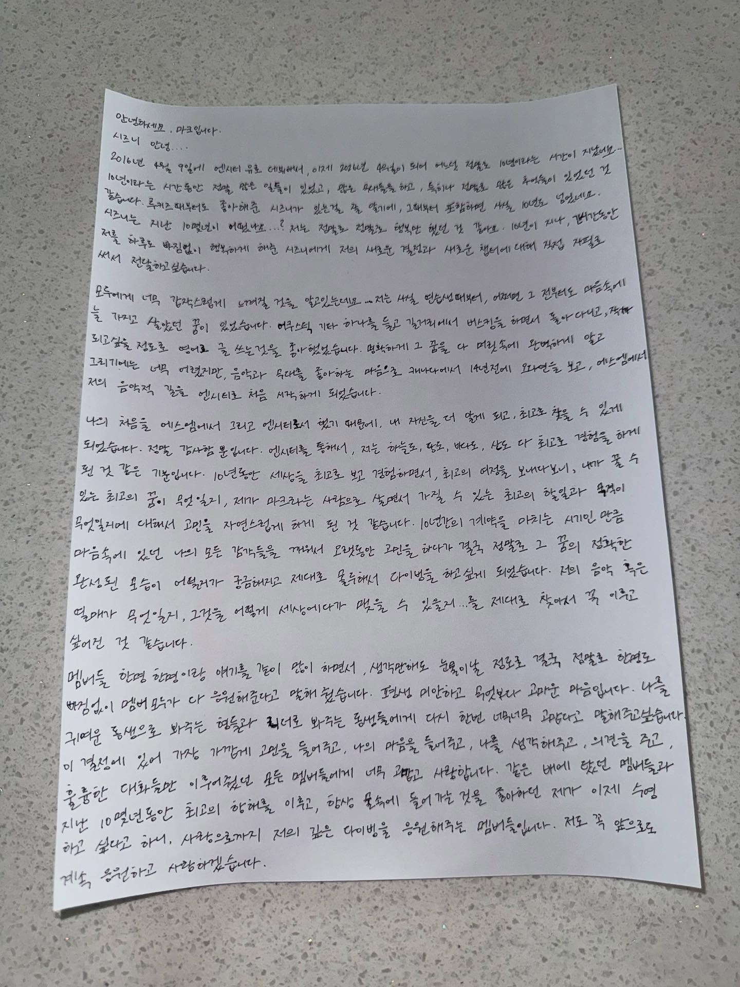 李马克于4月3日通过自己的社交媒体上传了一封长篇亲笔信,坦露了离开SM娱乐公司和NCT的心情。