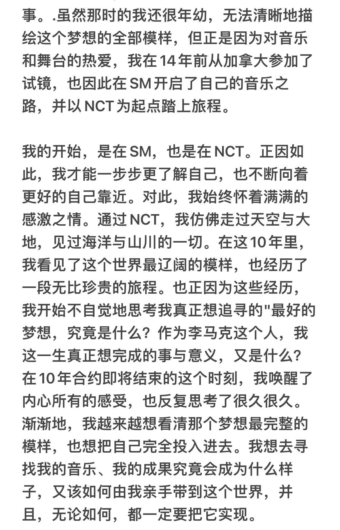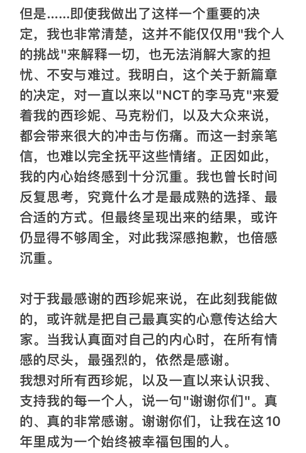 李马克在个人SNS上传的亲笔信全文如图他表示,希望去追寻属于自己真正的梦想:带着