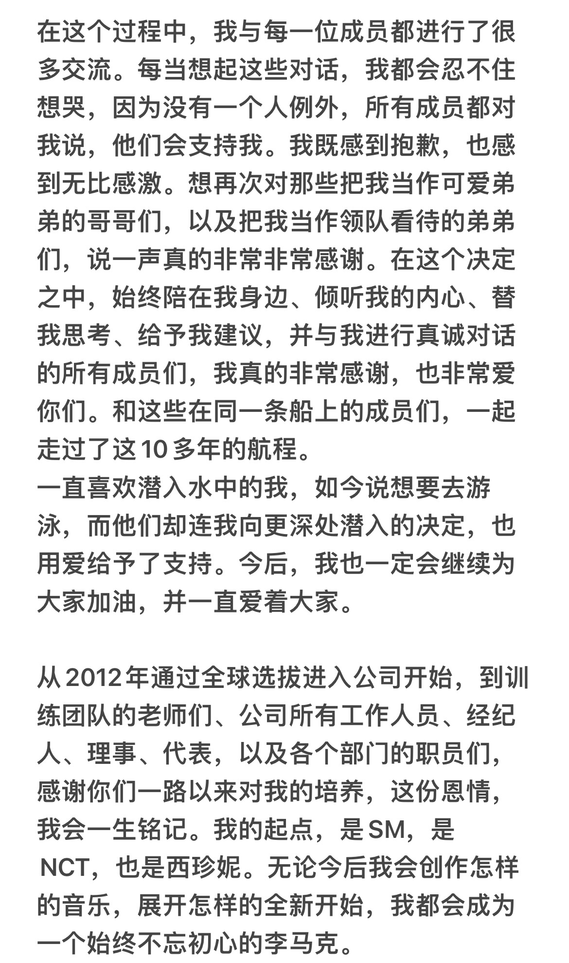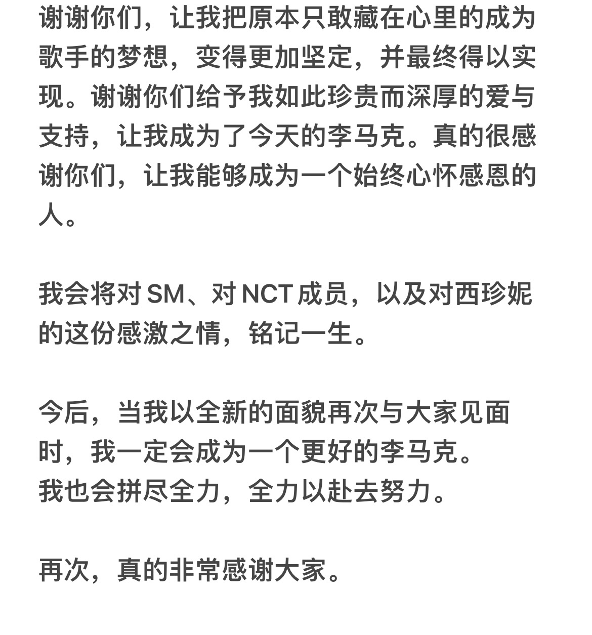 他表示,希望去追寻属于自己真正的梦想:带着原声吉他自由歌唱、用英语创作故事,亲自完成属于“李马克”的音乐与成果。信中感谢NCT全体成员的理解与全力支持,也对SM、工作人员、西珍妮表达了长久以来的感恩,称自己的起点是SM、是NCT,会永远铭记。