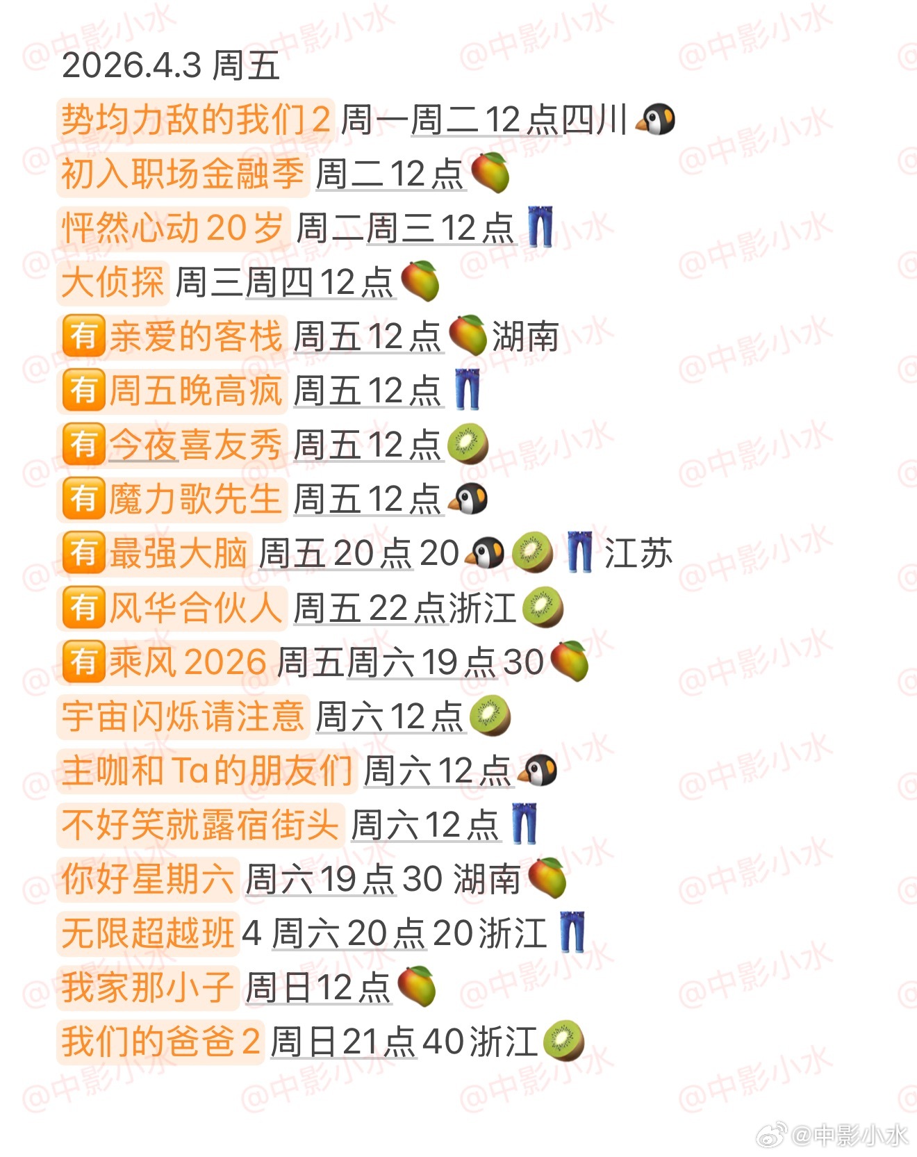 🈶亲爱的客栈 🈶周五晚高疯 🈶今夜喜友秀 🈶魔力歌先生 🈶最强大脑 🈶风华合伙人 🈶乘风2026