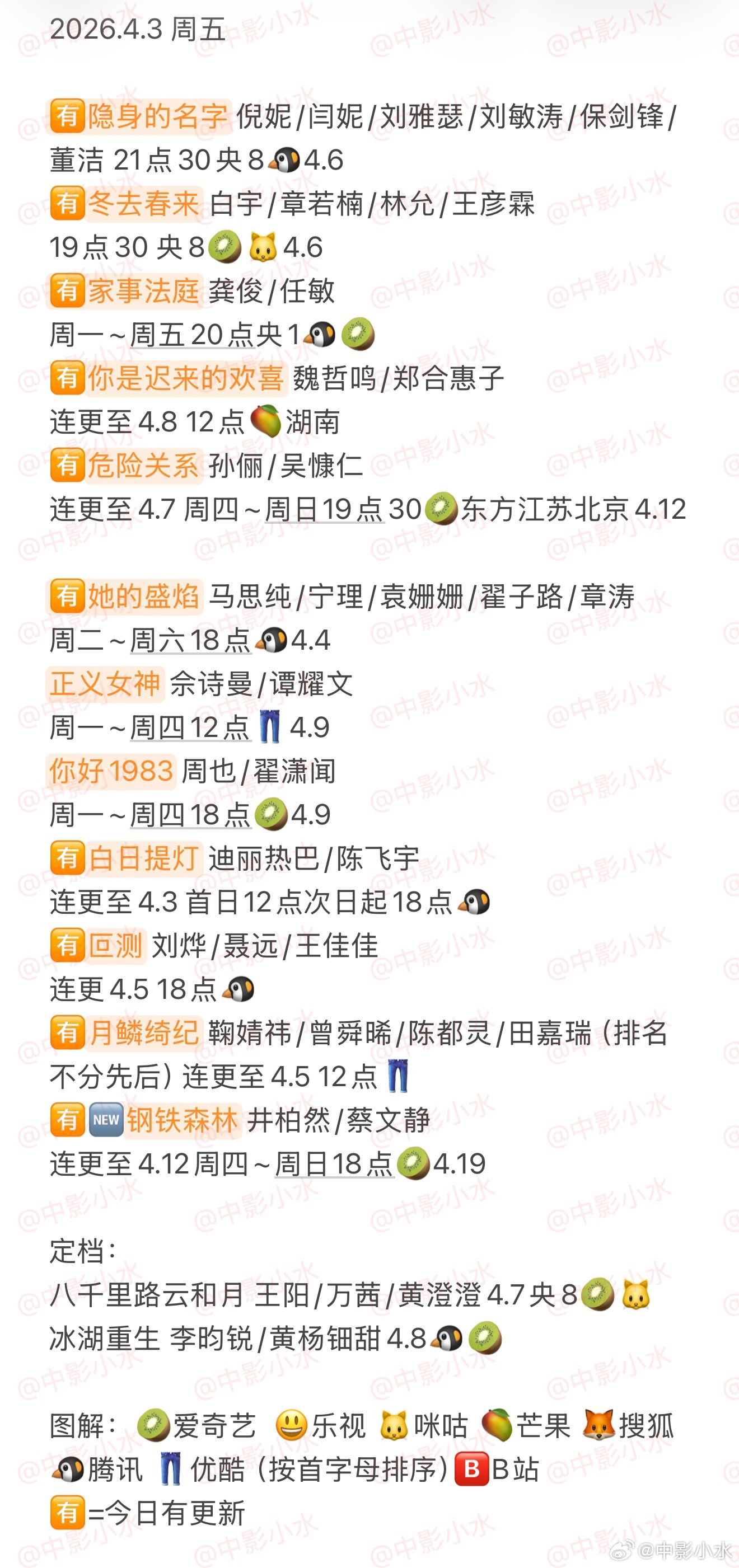 拯救剧荒 4月3日,今晚看点啥??图1 追剧日历 图2 综艺日历 图3 已完结剧集 🈶隐身的名字 倪妮/闫妮/刘雅瑟/刘敏涛/保剑锋/董洁🈶冬去春来 白宇/章若楠/林允/王彦霖🈶家事法庭 龚俊/任敏🈶你是迟来的欢喜 魏哲鸣/郑合惠子🈶危险关系 孙俪/吴慷仁