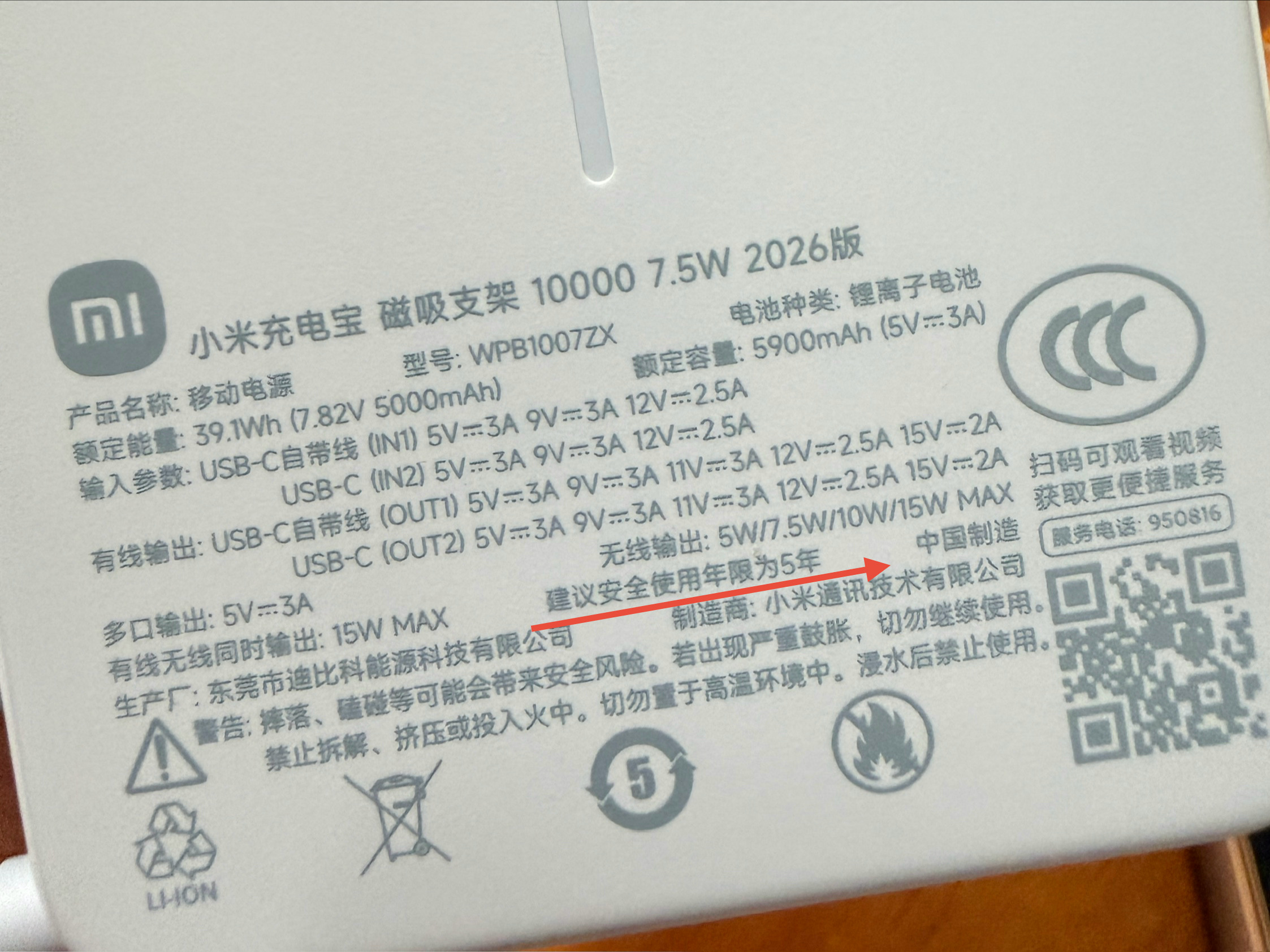 小米充电宝 磁吸支架 10000 7.5W 2026版,一款新国标充电宝,有了全新的3C标志,升级了可以查询充电次数、电池健康度、异常充电情况功能,另外支持15项的安全测试,背面有标注“建议安全使用年限为5年”,重点是它在折叠支架的位置,标注了生产日期,让你用的更放心